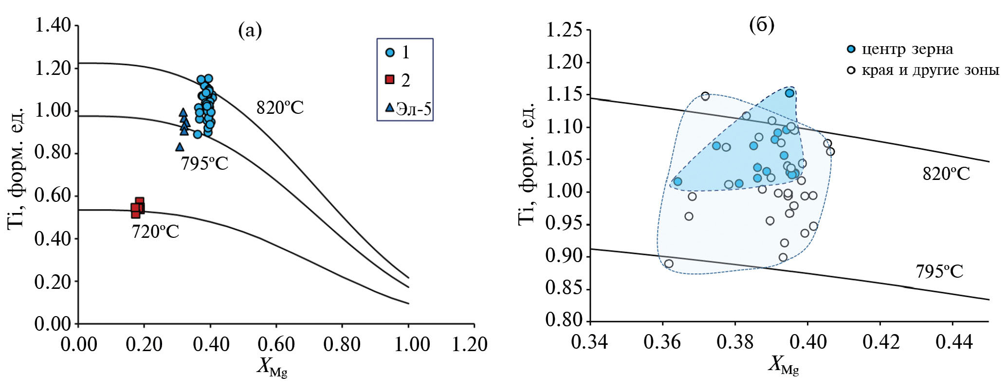 Основным минералом, несущим наиболее полную информацию о флюидном режиме гранитов, является биотит, в котором как минимум две изотопные системы (δ18О, δD) могут отражать воздействие водного флюида. Для реконструкции изотопных параметров флюида необходимо оценить температуру формирования биотита. Один из независимых способов – оценка по распределению Ti и Mg в минерале (Ti—ХMg термометр; Henry, 2005). Согласно составу проанализированных образцов биотита в эльджуртинских гранитах (см. Supplementary 1, ESM_3), интервал полученных значений температуры оказался крайне узким – от 795 до 820оС (рис. 13а), причем центральные части зерен биотита, наименее затронутые процессами диффузионного перераспределения элементов, показали еще более узкий интервал температуры, близкий к 820оС (рис. 13б). Исключение составил биотит из образца мусковит-биотитового гранита (обр. Эл-14, 720оС) и обр. Эл-5, в котором он имеет отчетливые следы хлоритизации и пониженное содержание Mg. Для остальных биотитов можно принять единый верхний предел температуры формирования, равный 820 ± 12оС (с учетом ошибки геотермометра, Henry, 2005).