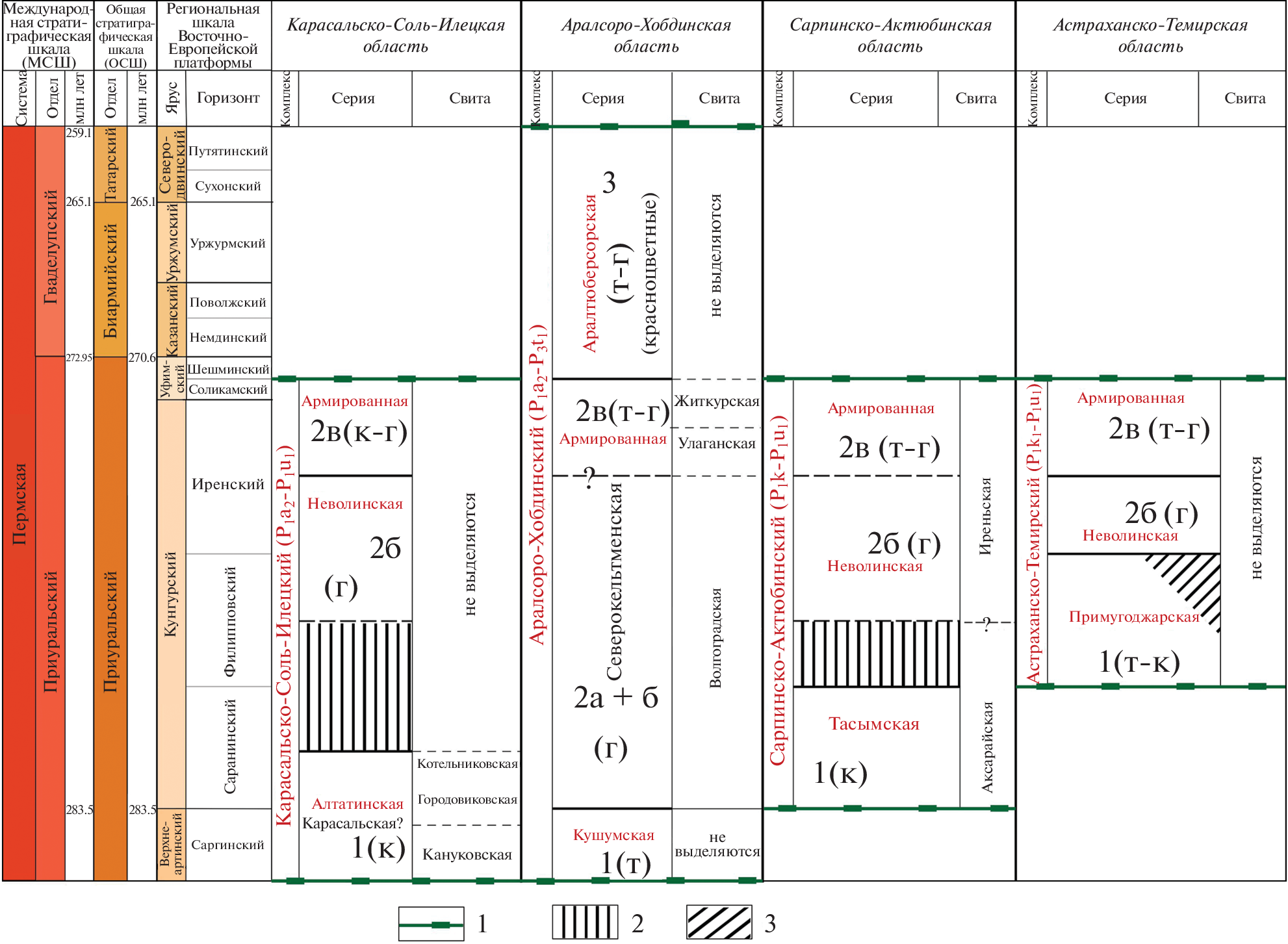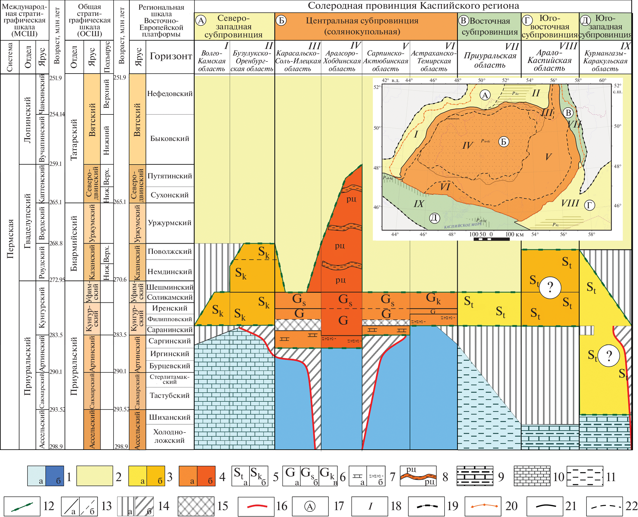 The paper deals with the composition and stratigraphy of the evaporite formation in the salt-producing province of the Caspian region. Based on seismostratigraphic approach, the correlation of geological sections in the lateral areas of the salt-producing province with the halokinetically deformed sections in the central areas of the Preсaspian depression is proposed. As a result of the research, a new local stratigraphic scheme of the Permian evaporite formation of the Central subprovince is proposed and the principles of its construction using the results of the seismostratigraphic analysis of the Asselian-Tatarian seismogeological substage and the accepted serial legends of three groups of sheets of geological maps (scale 1 : 1000 000; Scyphian (South-European), Central-European, and Uralian maps) are outlined. The results obtained significantly clarify the known schemes of the oil and geological zoning of the Caspian oil and gas province and contribute to the development of the resources of the deep (subsalt) horizons of its sedimentary cover.