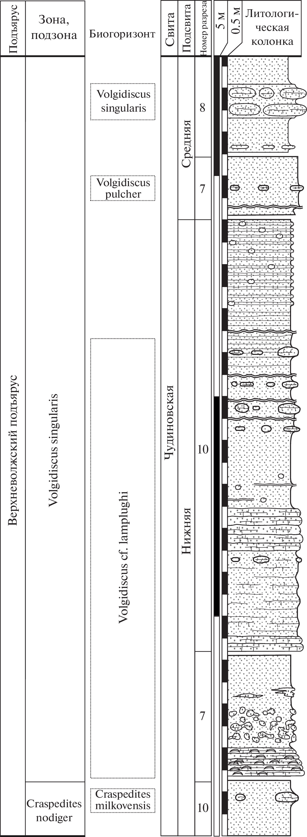 The study of new sections of the upper part of the Upper Volgian substage near the Vasilyevskoye village (R-ybinsk district, Yaroslavl region) made it possible to clarify the position of the lower boundary and the infrazonal division of the Volgidiscus singularis Zone. Until recently, the lower part of the Singularis Zone was not characterized by ammonites, but thanks to the study of these sections, it was possible to establish the sequence of craspeditins ammonoids (Volgidiscus and Anivanovia) and to identify a new biohorizon Volgidiscus cf. lamplughi. The lower boundary of the Singularis Zone in the Chudinovskaya Formation sections is determined by the first appearance of Volgidiscus above the Craspedites milkovensis biohorizon. The infrazonal volume of the Singularis Zone is represented by three biohorizons: V. cf. lamplughi, V. pulcher and V. singularis. At present, the Singularis Zone is characterized by the most complete structure in the Panboreal Superrealm, which allows it to be considered as an infrazonal standard for the upper part of the Upper Volgian substage.