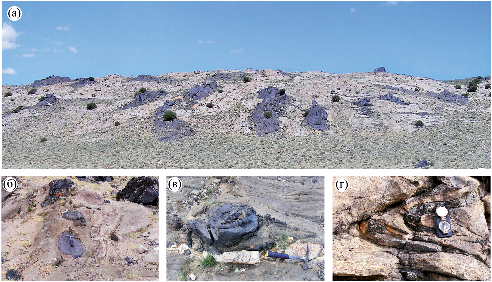 Складчатые структуры раннего эпизода метаморфизма (М1) в Цогтской, Цэлской, Бодончинской и других пластинах имели изначально субмеридиональную ориентировку (в современной структуре), то есть не совпадающую с главными картируемыми северо-западными и широтными структурами тектонических пластин ЮАМП (Козаков, 1986; Козаков и др., 2007, 2011, 2022). Это фиксирует положение шарниров реликтовых складок и линейности (рис. 5а, 5б). Наложение регионального метаморфизма позднего эпизода (М2) сопровождалось образованием на ранней стадии структур лежачих складок (рис. 5в, 5г).