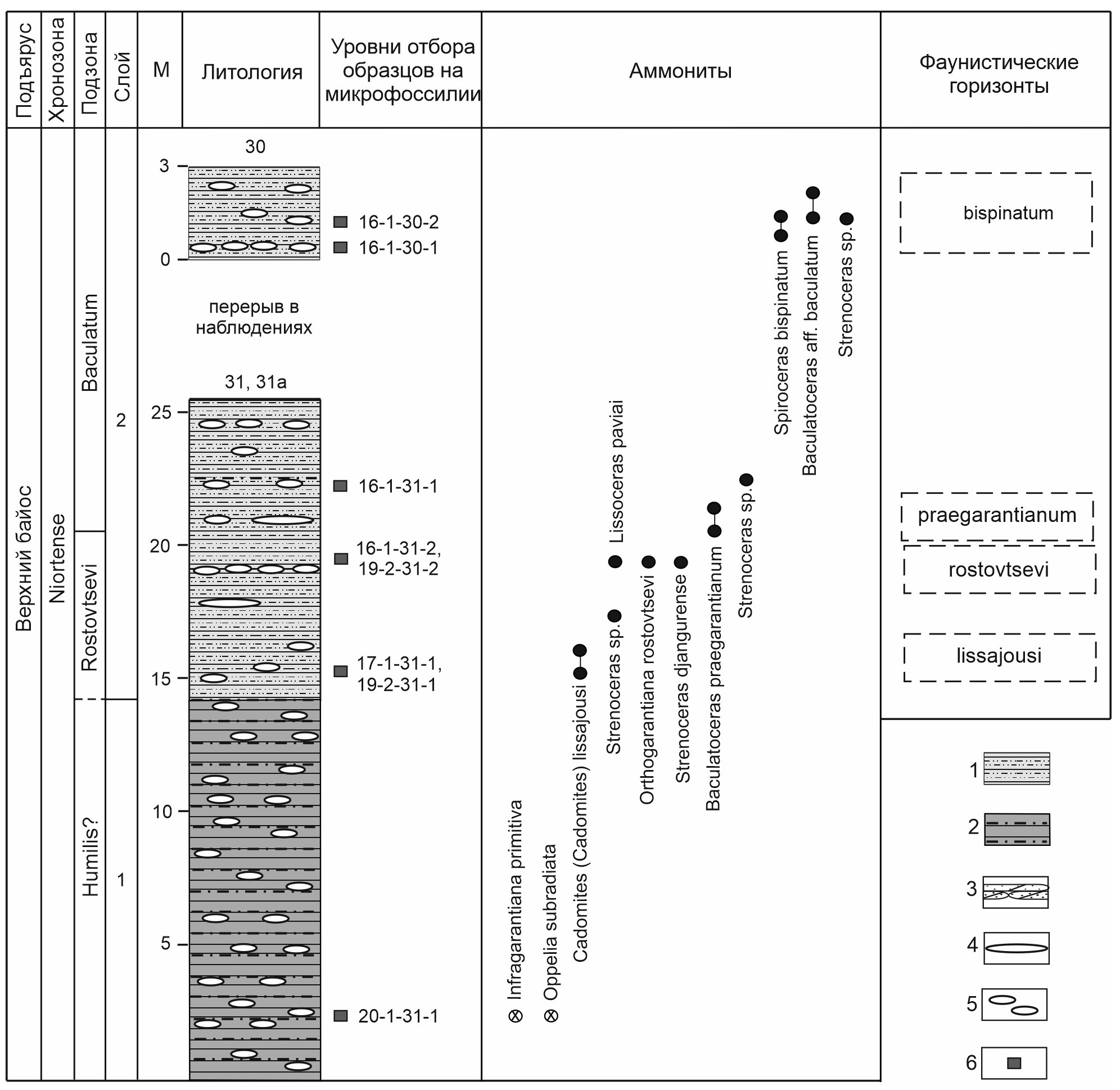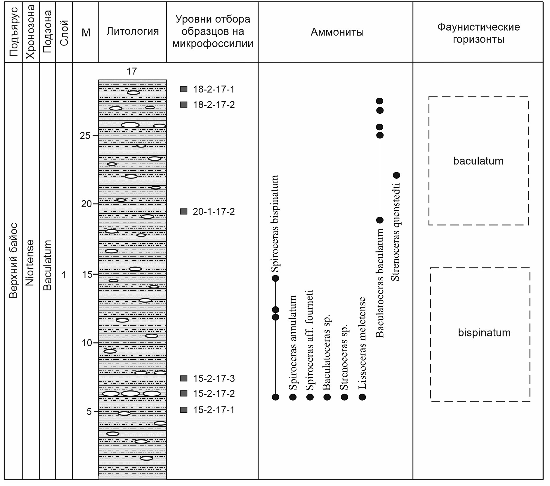 Охарактеризованный аммонитами разрез зоны Niortense надстраивается на правобережье р. Кяфар (местонахождение 17); здесь установлены фаунистические горизонты Spiroceras bispinatum → Baculatoceras baculatum (рис. 3).