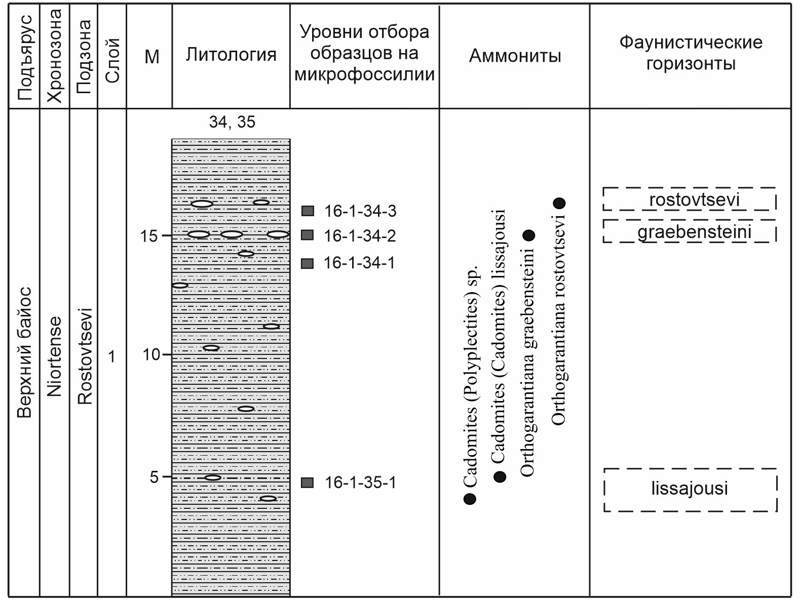 Восточнее, на правом берегу р. Бол. Зеленчук близ станицы Зеленчукская (местонахождения 34, 35), изучена средняя часть зоны Niortense. Здесь установлена следующая последовательность фаунистических горизонтов: Cadomites lissajousi → Orthogarantiana graebensteini → Orthogarantiana rostovtsevi (рис. 4).