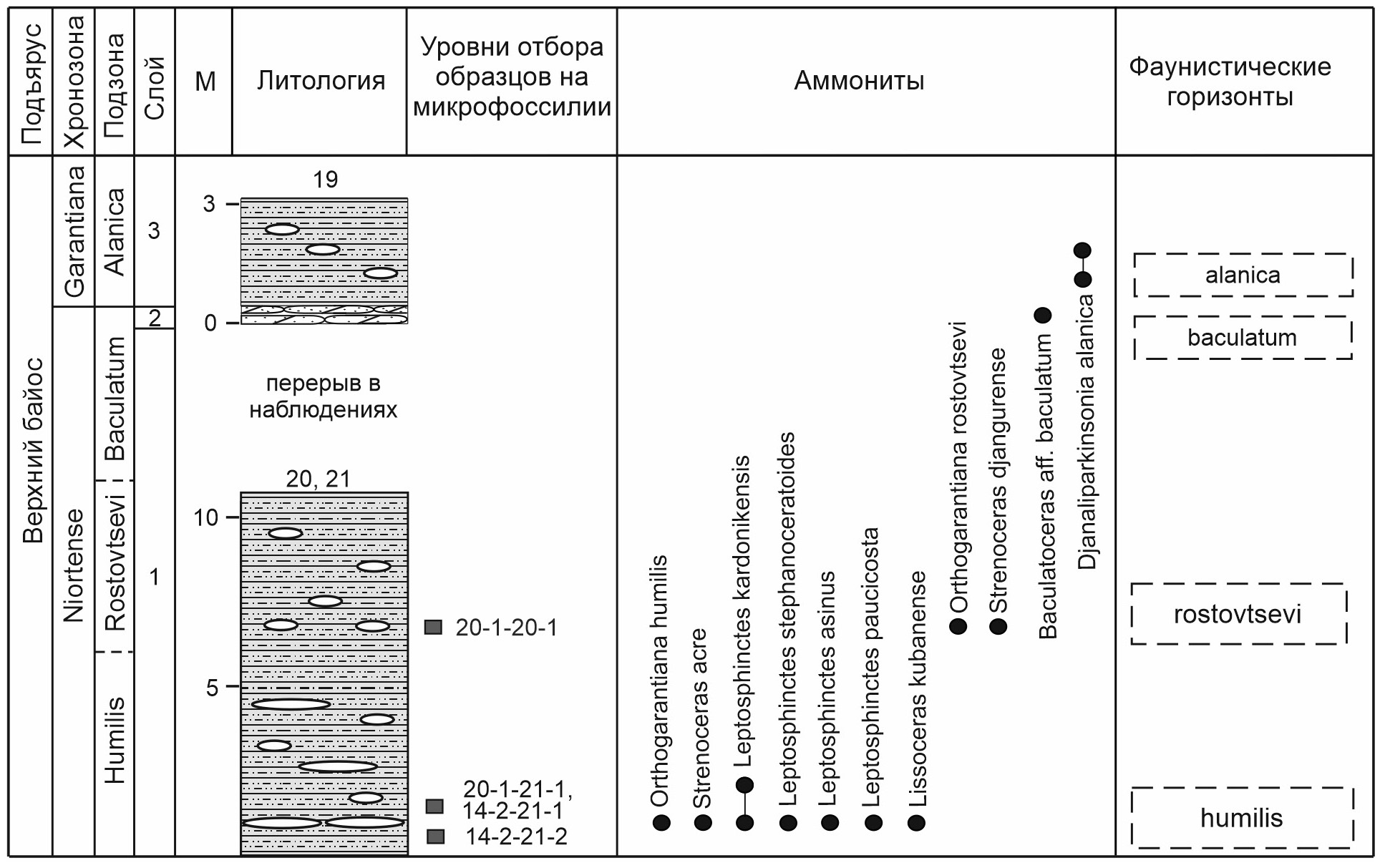 За кровлю зоны Niortense, как указывалось выше, принят песчаник с Baculatoceras cf. baculatum (Quenstedt) в местонахождении 19 (рис. 5) на р. Кубань ниже станицы Красногорская, перекрывающийся глинами зоны Garantiana garantiana (Митта, 2018; Mitta, 2019, 2021).