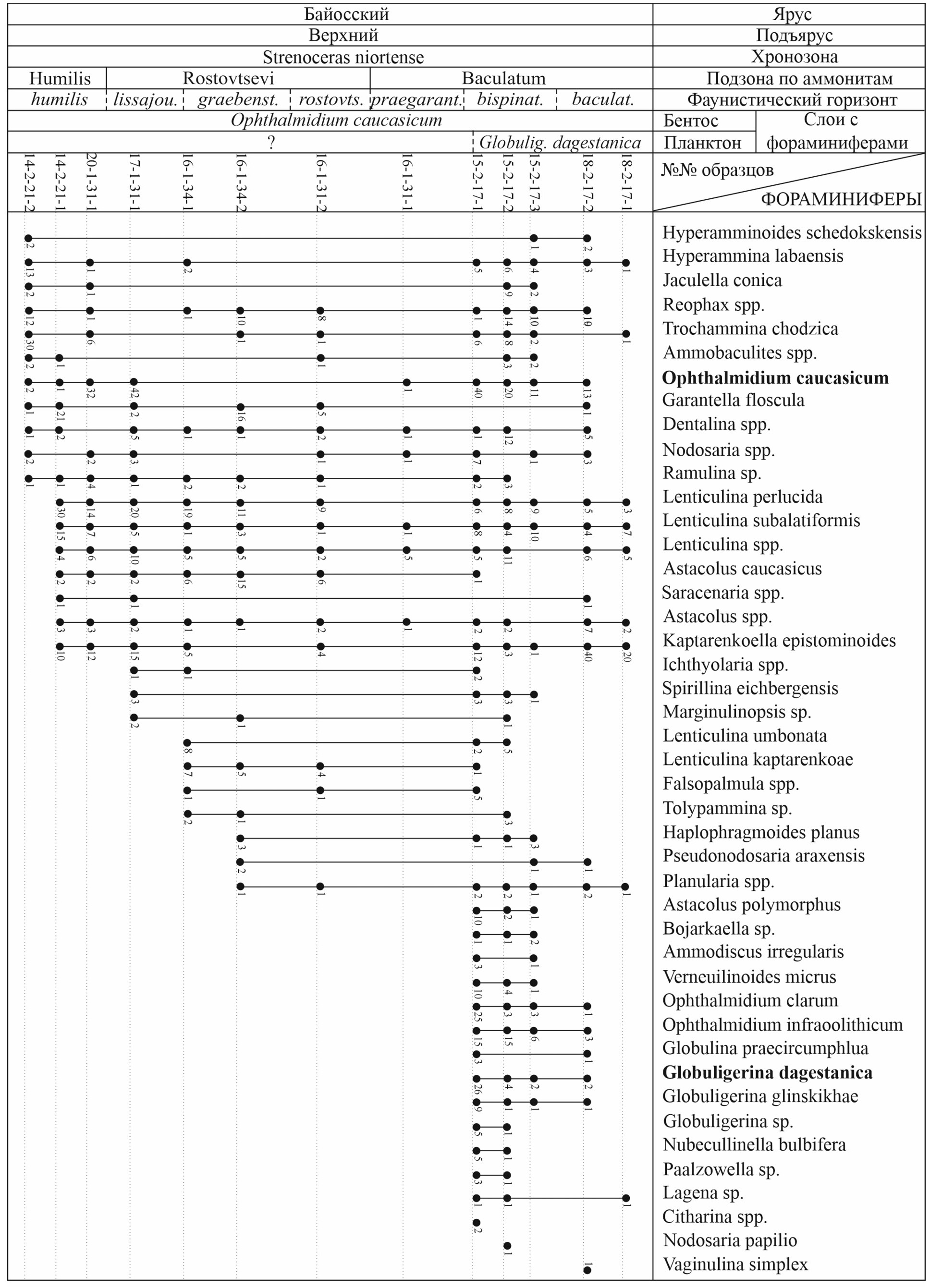 В изученном интервале джангурской свиты, отвечающем зоне Strenoceras niortense верхнего байоса, установлены разнообразные в таксономическом отношении комплексы фораминифер, содержащие как бентосные, так и (в верхах зоны) планктонные формы разной степени сохранности. Встречены представители более 50 видов, относящихся к 33 родам (рис. 6). По разрезу фораминиферы распределены неравномерно. В нижней части зоны (подзоны Humilis и Rostovtsevi) в комплексах встречаются представители 9–12 родов; в верхней части зоны (подзона Baculatum, фаунистический горизонт praegarantianum) определен обедненный комплекс, насчитывающий десять экземпляров из пяти родов; выше по разрезу (подзона Baculatum, фаунистические горизонты bispinatum, baculatum) выявлены наиболее многочисленные и разнообразные в таксономическом отношении комплексы, содержащие представителей более 20 родов бентосных фораминифер и одного рода планктонных фораминифер (рис. 6).