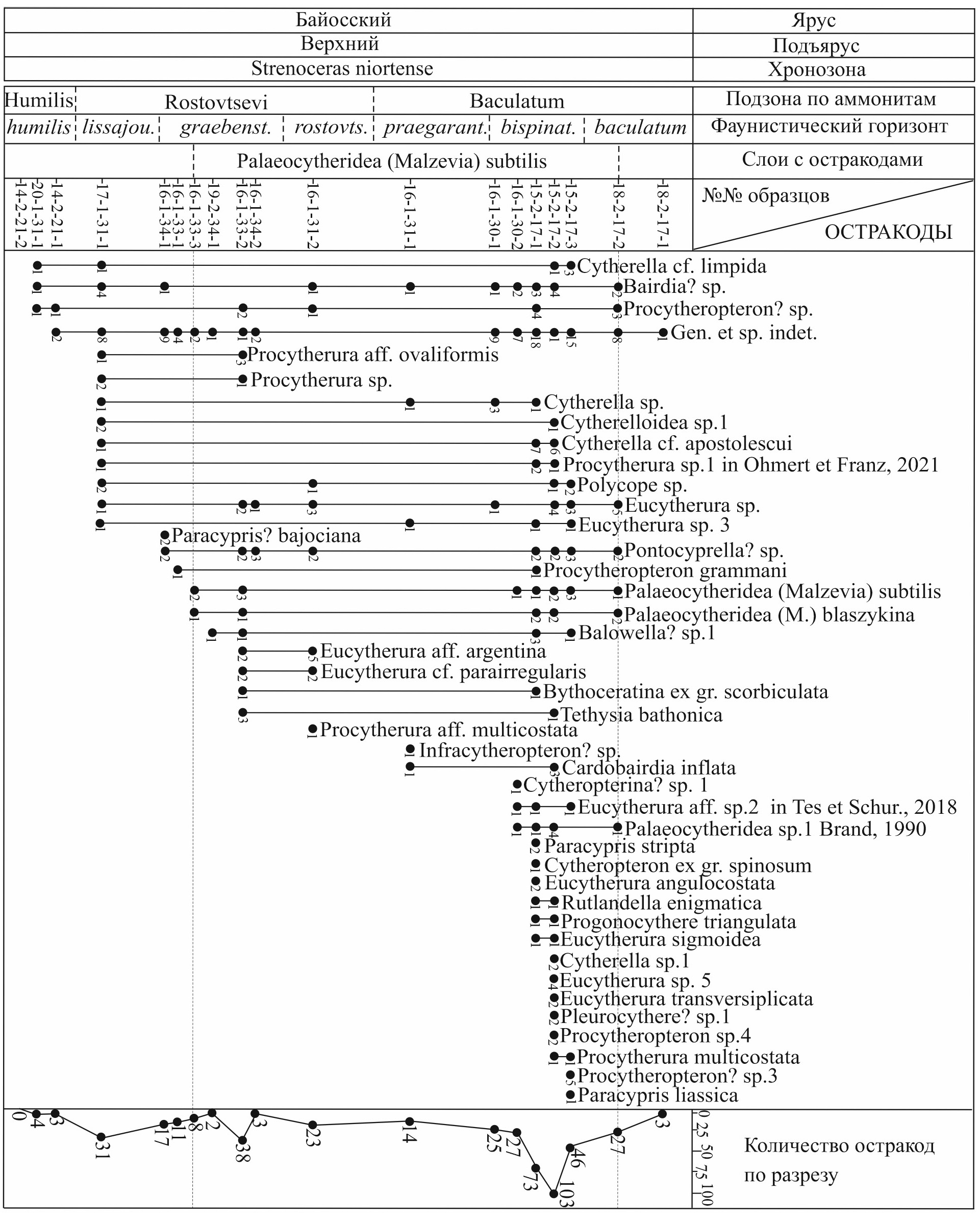 Сохранность раковин от хорошей до удовлетворительной, по разрезу остракоды распределены неравномерно. В нижней части зоны Niortense (подзона Humilis, фаунистический горизонт humilis) встречены представители четырех родов; выше по разрезу таксономическое разнообразие и численные характеристики увеличиваются до 21 рода (подзона Baculatum, фаунистический горизонт bispinatum), а затем в верхах сокращаются до семи родов (подзона Baculatum, фаунистический горизонт baculatum). Многочисленны и разнообразны раковины семейства Cytheruridae: Procytherura, Wellandia, Eucytherura, Balowella?, Paranotacythere, Cytheropteron, Cytheropterina?, Eocytheropteron, Procytheropteron?, Infracytheropteron?. Встречены следующие таксоны: Palaeocytheridea (Malzevia) subtilis Permjakova, Cytherella cf. limpida Blaszyk, Cytherelloidea sp. 1, Eucytherura sp. 5, E. transversiplicata (Bate et Coleman), Procytherura sp. 1, P. multicostata Ainsworth, Balowella? sp. 1, Progonocythere triangulata Braun in Ohmert. Наряду с перечисленными встречен ряд видов из изученных ранее вышележащих отложений: Procytherura ovaliformis Brand, Cytherella sp. 1 Savelieva in Mitta et al., 2021 (зона Garantiana); Procytheropteron gramanni Brand, Cardobairdia inflatа Szczechura et Blaszyk (зона Parkinsoni); Palaeocytheridea (Malzevia) blaszykina Franz et al., Eucytherura aff. argentina Ballent, E. sigmoidea Brand, Tethysia bathonica Sheppard (зоны Garantiana и Parkinsoni); Rutlandella enigmatica Sheppard (зоны Parkinsoni, Garantiana и Zigzag); Cytherella cf. limpida Blaszyk, Bythoceratina ex gr. scorbiculata (Triebel et Bartenstein), Eucytherura angulocostata Knitter, Paracypris liassica Bate et Coleman (зона Zigzag) (Митта и др., 2017, 2018, 2021).