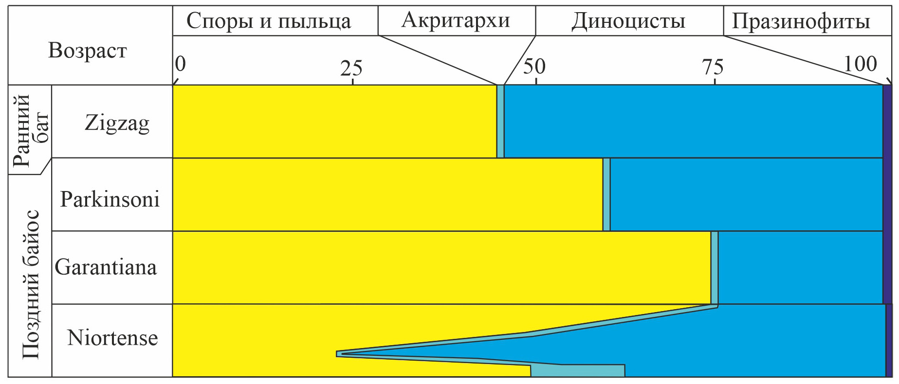 Изучение соотношения морских и наземных палиноморф в верхнем байосе (зоны Garantiana, Parkinsoni) и базальном бате (Митта и др., 2021) выявило постепенные изменения, свидетельствующие о трансгрессивном удалении береговой линии вверх по разрезу верхнего байоса и базального бата в пределах шельфа; в зоне Niortense это соотношение изменяется скачкообразно.
