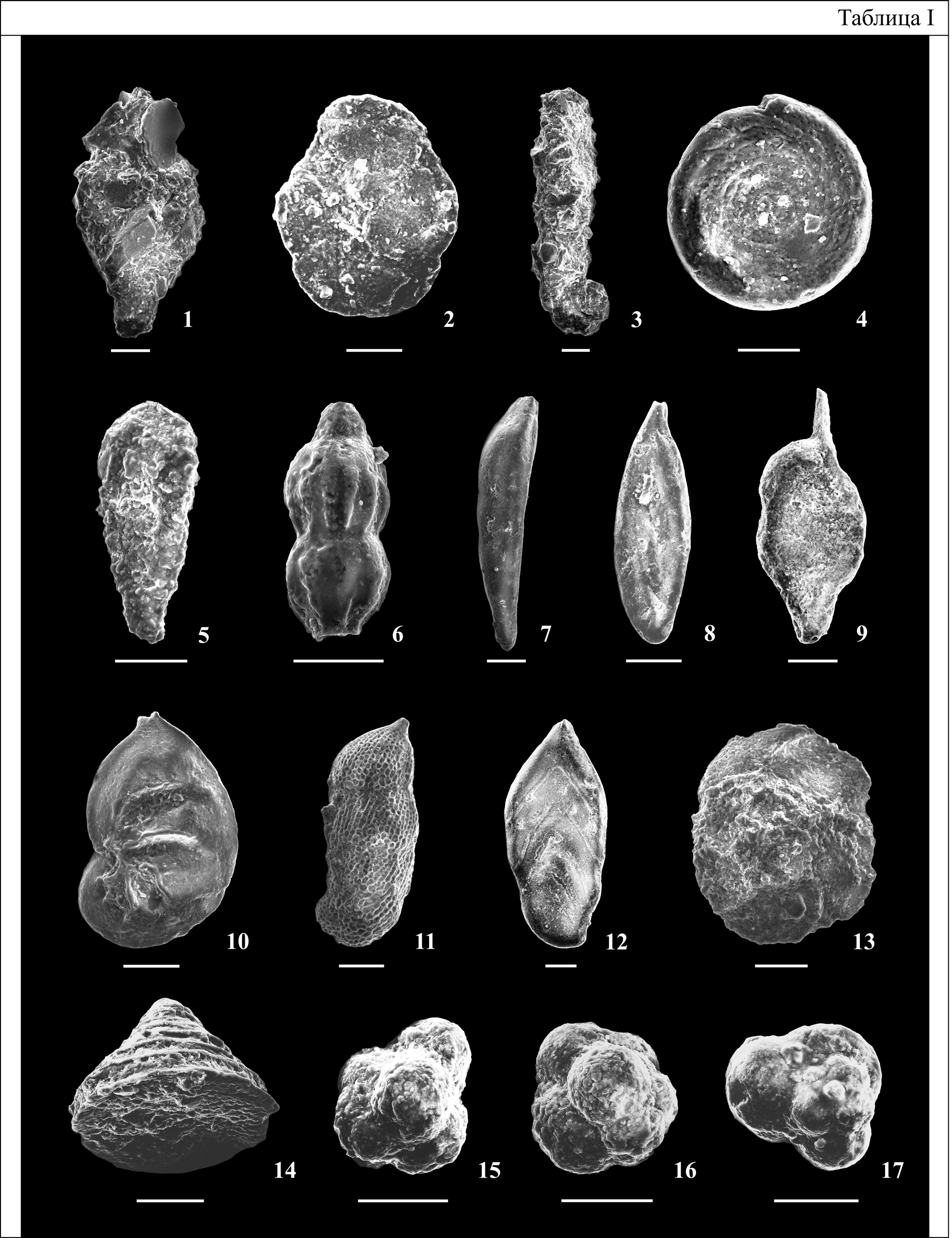 Таблица I. Фораминиферы зоны Strenoceras niortense верхнего байоса бассейна р. Кубань. Длина масштабной линейки 100 мкм