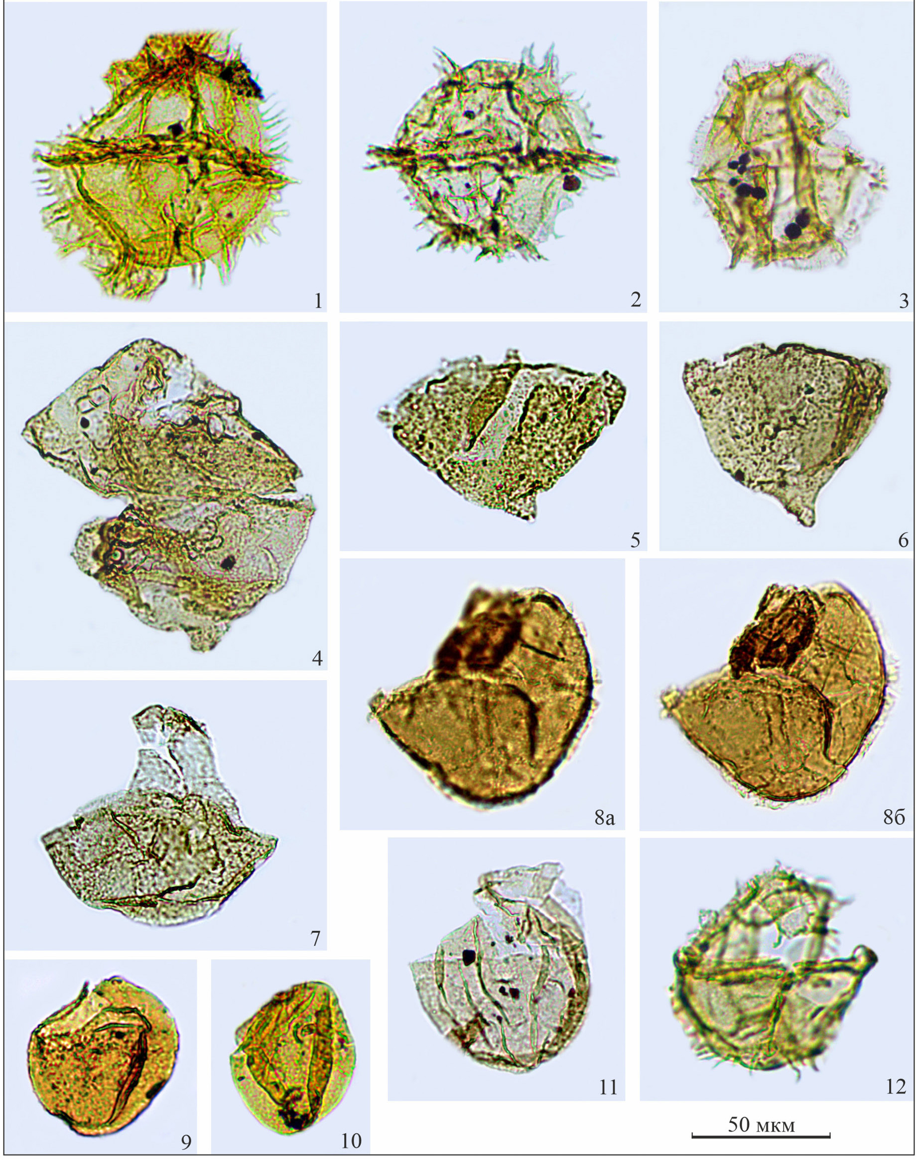 1, 2 — Ctenidodinium ornatum (Eisenack, 1935) Deflandre, 1939; 3 — Ctenidodinium continuum Gocht, 1970; 4, 5, 6 — Dissiliodinium caddaense (Filatoff, 1975) Stover et Helby, 1987; 7, 11 — Dissiliodinium spp.; 8а, 8б — Korystocysta pachyderma (Deflandre, 1939) Woollam, 1983; 9, 10 — Dissiliodinium “granulatum”; 12 — Durotrigia daveyi Bailey, 1987