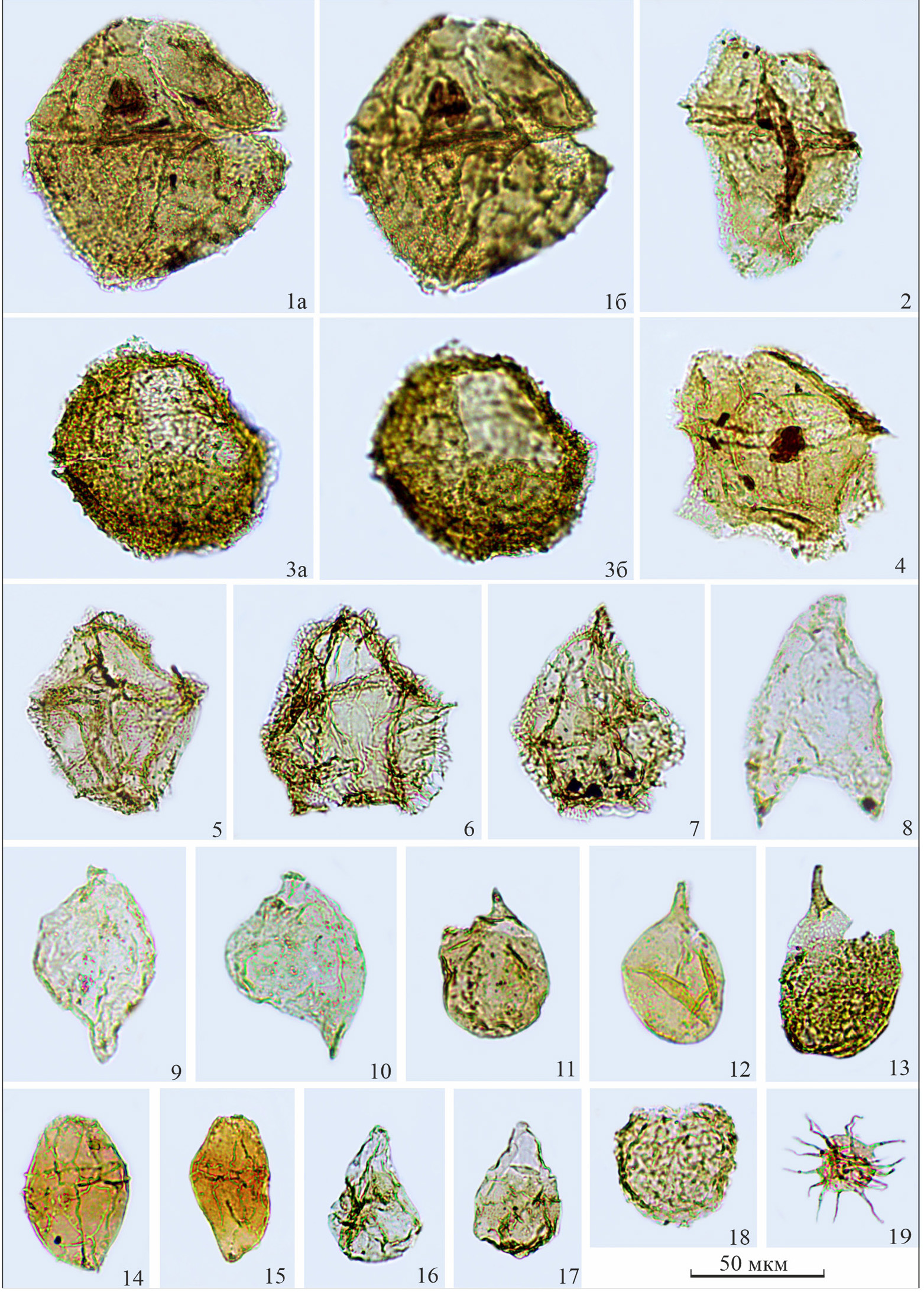 1а, 1б, 3а, 3б — Cribroperidinium crispum (Wetzel, 1967) Fenton, 1981; 2, 4 — Meiourogonyaulax valensii Sarjeant, 1966; 5, 6, 7 — Rhynchodiniopsis? regalis (Gocht, 1970) Jan du Chêne et al., 1985; 8 — Nannoceratopsis spiculata Stover, 1966; 9 — Nannoceratopsis senex van Helden, 1977; 10 — Nannoceratopsis gracilis Alberti, 1961; 11, 12 — Evansia granulata Pocock, 1972; 13 — Paraevansia brachythelis (Fensome, 1979) Below, 1990; 14, 15 — Carpathodinium predae (Beju, 1971) Drugg, 1978; 16, 17 — Phallocysta eumekes Dörhöfer et Davies, 1980; 18 — Valensiella ovulum (Deflandre, 1947) Eisenack, 1963; 19 — Micrhystridium sp.
