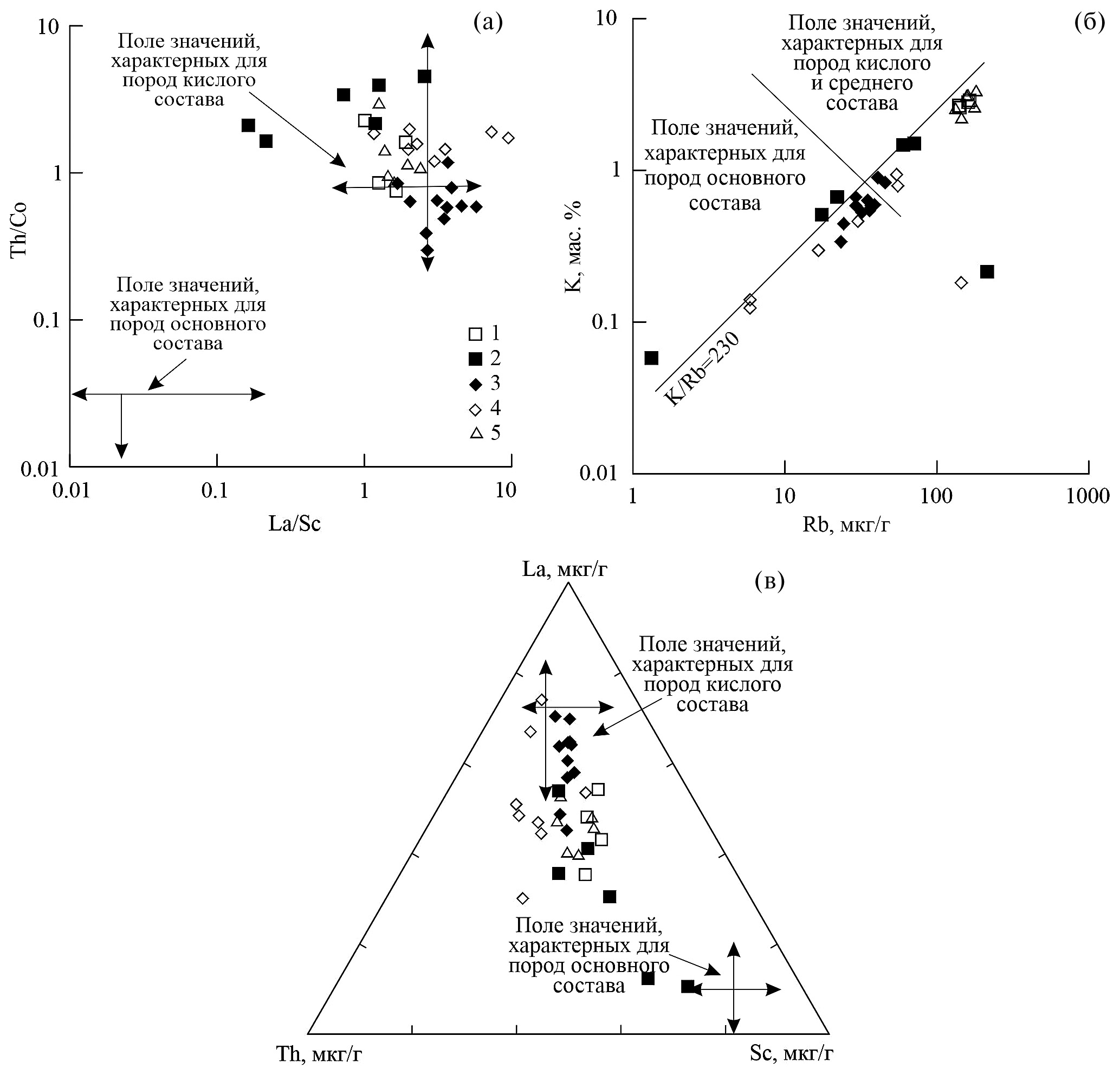 На диаграмме Rb–K (Floyd, Leveridge, 1987) фигуративные точки состава песчанистых алевролитов нортуйской свиты и алевролитов надаровской свиты лежат компактно в поле пород, источниками которых являются образования кислого и среднего состава (рис. 8б). Песчаники надаровской свиты характеризуются значительными вариациями содержаний K и Rb и попадают в поле пород, сформированных за счет размыва образований кислого, среднего и основного состава.