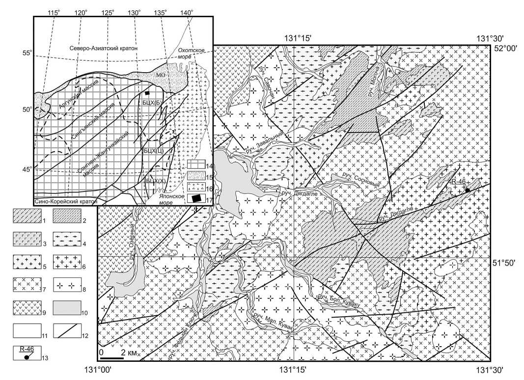 1 – условно верхнеархейские биотитовые и двуслюдяные гнейсы и кристаллические сланцы, высокоглиноземистые гнейсы, биотит-роговообманковые и роговообманковые гнейсы дягдаглейской толщи; 2 – условно раннепротерозойские амфиболиты, роговообманковые и диопсидовые кристаллические сланцы и гнейсы; 3 – условно позднеархейские габбро-амфиболиты амурского комплекса; 4 – условно позднеархейские гнейсовидные гранитоиды древнебуреинского комплекса; 5 – условно раннепротерозойские рассланцованные гранитоиды нятыгранского комплекса; 6 – условно раннепалеозойские гранитоиды; 7 – условно позднепалеозойские кварцевые диориты, гранодиориты, граниты тырмо-буреинского комплекса; 8 – раннемезозойские граниты, лейкограниты харинского комплекса; 9 – раннемеловые андезиты, дацитоандезиты, дациты, их туфы; 10 – нижне- и среднечетвертичные отложения; 11 – верхнечетвертичные отложения; 12 – разломы, 13 – место отбора образца для геохронологических исследований и его номер. На врезке: прямоугольником показано положение исследуемого объекта в структуре восточной части Центрально-Азиатского складчатого пояса (тектоническая основа по (Красный, Пэн Юньбяо, 1999; Zhou, Wilde, 2013; Luan et al., 2017a)), с изменениями авторов; 14 – континентальные массивы/террейны: БЦХ ‒ Бурея-Цзямуси-Ханкайский супертеррейн (БЦХ(Б) – Буреинский, БЦХ(Ц) – Цзямусинский, БЦХ(Х) – Ханкайский континентальный массивы/террейны); 15 – палеозойские–раннемезозойские складчатые пояса: МО – Монголо-Охотский складчатый пояс; 16 – позднеюрско-раннемеловые орогенные пояса; 17 – район исследования.
