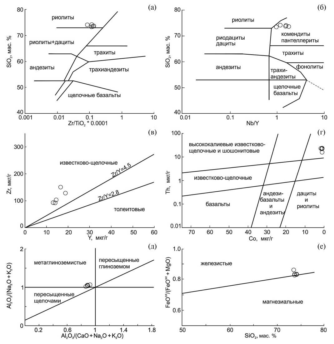 На диаграммах SiO2–(Zr/TiO2)×0.0001 и SiO2–Nb/Y (Winchester, Floyd, 1977) точки составов метавулканитов дягдаглейской толщи занимают поля, соответствующие риолитам и кислым породам семейства пантеллеритов-комендитов (рис. 3а, 3б). По соотношению Zr–Y (Ross, Bédard, 2009) и Th–Co (Hastie et al., 2007) рассматриваемые метавулканиты отвечают породам известково-щелочной (рис. 3в) и высококалиевой известково-щелочной серий (рис. 3г). Для них установлены низкие величины ASI = 0.87–0.92 (табл. 1), свойственные метаглиноземистым породам (рис. 3д), и высокие значения железистости Fe2O3*/(Fe2O3* + MgO) = = 0.82–0.86 (рис. 3е).