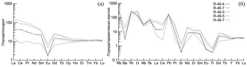 Метавулканиты дягдаглейской толщи характеризуются слабо- и умеренно- фракционированным распределением РЗЭ ([La/Yb]n = 1.30–15.22), с обогащением легкими РЗЭ ([La/Sm]n = 1.78–4.44), и слабо фракционированным распределением тяжелых РЗЭ ([Gd/Yb]n = 0.52–2.25), с отчетливо выраженной отрицательной европиевой аномалией Eu/Eu* = 0.09–0.28 (рис. 4а). На графиках распределения нормированных к примитивной мантии содержаний микроэлементов отчетливо выражены отрицательные аномалии Nb, Sr, Ti и положительные аномалии Th, Ta, Pb, Nd, Gd (рис. 4б).