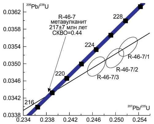 Выделение циркона для геохронологических исследований проведено по стандартной методике с использованием тяжелых жидкостей. U–Pb (ID-TIMS) геохронологические исследования выполнены в Институте геологии и геохронологии докембрия (ИГГД РАН, г. Санкт-Петербург). Выбранные для U–Pb геохронологических исследований кристаллы циркона (или их фрагменты) подвергались многоступенчатому удалению поверхностных загрязнений в спирте, ацетоне и 1 M HNO3. При этом после каждой ступени эти кристаллы промывались особо чистой водой. Химическое разложение циркона и выделение U и Pb выполнялось по модифицированной методике Т.Е. Кроу (Krogh, 1973). Изотопные анализы выполнены на многоколлекторном масс-спектрометре TRITON TI как в статическом режиме, так и при помощи счетчика ионов. Для изотопных исследований использовался трассер 235U‒202Pb. Точность определения содержаний U и Pb составила 0.5%. Холостое загрязнение не превышало 15 пг Pb и 1 пг U. Обработка экспериментальных данных проводилась при помощи программ PbDAT (Ludwig, 1991) и ISOPLOT (Ludwig, 2003). При расчете возрастов использованы общепринятые значения констант распада урана (Steiger, Jager, 1976). Поправки на обычный свинец введены в соответствии с модельными величинами (Stacey, Kramers, 1975). Все ошибки приведены на уровне 2s.