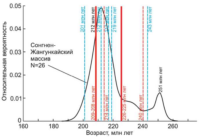 Наиболее распространены в пределах Буреинского массива известково-щелочные гранитоиды, относимые (Мартынюк и др., 1990; Петрук, Волкова, 2006; Васькин, Дымович, 2009 и др.) к позднепалеозойскому многофазному габбро-диорит-гранодиорит-гранитовому тырмо-буреинскому комплексу. Однако установлено, что целая серия петротипических массивов этого комплекса имеет не позднепалеозойский, а раннемезозойский возраст – 218–185 млн лет (Сорокин и др., 2007, 2010). Раннемезозойские оценки возраста были также получены для щелочных, субщелочных гранитоидов и вулканитов центральной части массива – 240–199 млн лет (Sorokin et al., 2016; Long et al., 2021).