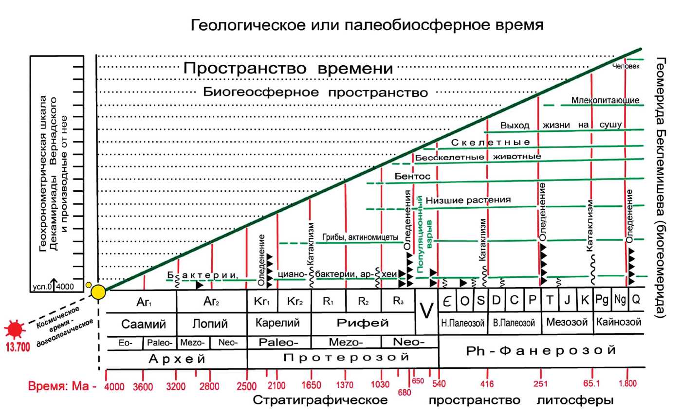 Но встает другой вопрос – что обеспечивает разномасштабную этапность и периодичность смены биосообществ разнообразных биохорий прошлого? При всей неоднородности трактовок этапности в развитии биосферы в литературе, все чаще делаются попытки выявить биосферные ритмы разного масштаба, отражающие направленность ее эволюции. Частным выражением этого процесса могут считаться массовые вымирания биоты, которые происходили, видимо, с определенной периодичностью (Алексеев, 1989). Из них 4–5 считаются “великими” и около 15 – “малыми”. Интервалы между ними – порядка 30 млн лет (около 37 в палеозое, 26 в мезозое и кайнозое), хотя они не всегда выдерживаются в этих пределах. Продолжительность глобальных биотических кризисов оценивается до 10–15 млн лет (они отражают упрощение структуры сообществ, сокращение биоразнообразия и проч.). С другой стороны, в ряде работ (в частности, Шиманский, 1987) намечены крупные этапы эволюции органического мира фанерозоя, на основе которых были выделены геологические системы и отделы. А в одной из своих последних работ, посвященных общим проблемам развития биосферы и Геомериды, Б.С. Соколов (2010а, 2010б) привел наглядный рисунок (рис. 1), который построен на основе последних обобщений геологических материалов и отражает определенную этапность длительного эволюционного процесса, начиная с момента возникновения Земли, то есть с архея, и по конец фанерозоя (неоген и квартер). Рисунок 1 фактически отразил целое мировоззрение в области геологической истории нашей планеты (рисунок приведен здесь в авторском варианте 2010 г., хотя сейчас он может быть дополнен или подправлен появившимися новыми данными).