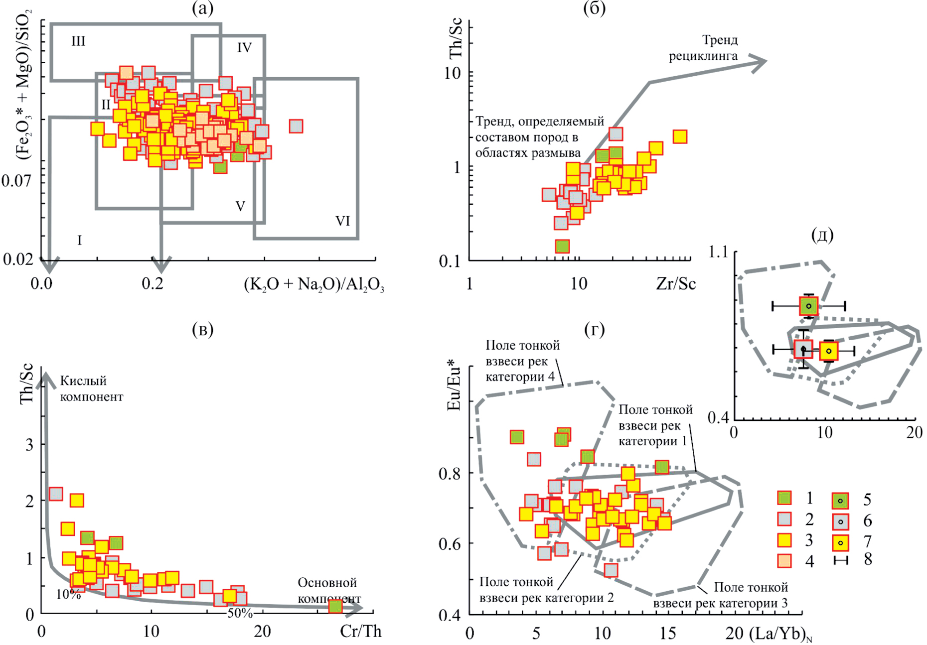 На диаграмме (La/Yb)N–Eu/Eu* (здесь нормирование проведено на хондрит (Taylor, McLennan, 1985), а расчет Eu-аномалии выполнен по формуле EuN/ÖSmN*GdN) с полями состава пелитовой фракции донных осадков приустьевых зон современных рек различных категорий точки состава глинистых пород волынского уровня в основном расположены в поле пелитовой фракции донных осадков приустьевых частей современных рек категории 4, питающихся продуктами размыва пород “вулканических” провинций (рис. 4г). Фигуративные точки глинистых пород редкинского региояруса можно видеть как в поле пелитовой фракции донных осадков приустьевых частей современных рек категории 4, так и в полях пелитовой фракции донных осадков приустьевых частей современных рек категорий 1 (крупные реки) и 2 (реки, дренирующие области распространения осадочных пород). Точки состава глинистых пород котлинского региояруса сосредоточены на данном графике в основном в поле пелитовой фракции донных осадков приустьевых частей современных крупных рек и рек, питающихся продуктами размыва осадочных пород. Наиболее ярко указанная тенденция проявлена при сравнении положения на указанной диаграмме усредненных точек состава глинистых пород венда (рис. 4д). Все сказанное находится в довольно хорошем соответствии с результатами исследований, полученными общегеологическими методами.