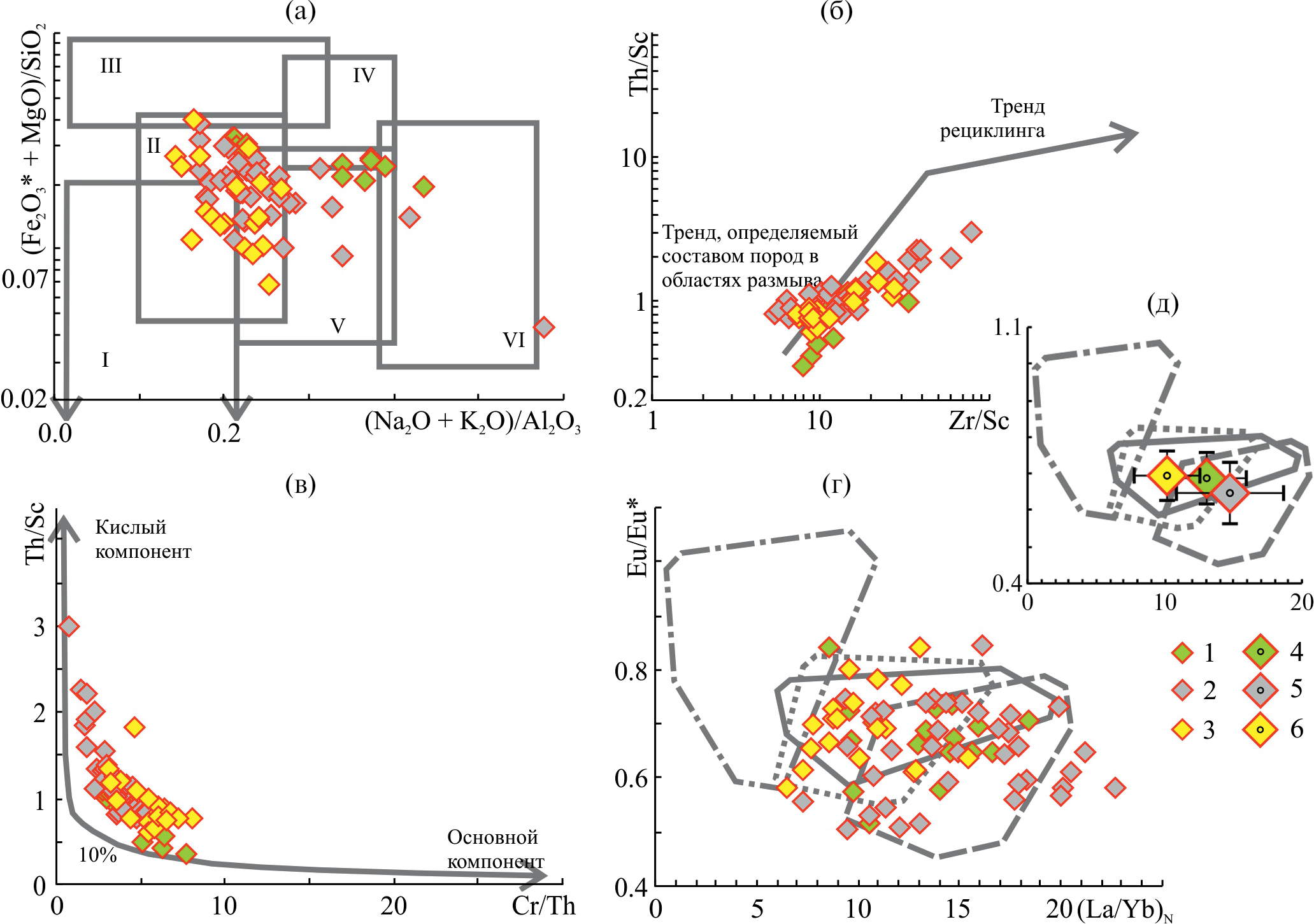 Рис. 10. Положение точек состава аргиллитов венда Юго-Восточного Беломорья на диаграммах (K2O + Na2O)/Al2O3–(Fe2O3* + MgO)/SiO2 (а), Zr/Sc–Th/Sc (б), Cr/Th–Th/Sc (в), (La/Yb)N–Eu/Eu* (г).
