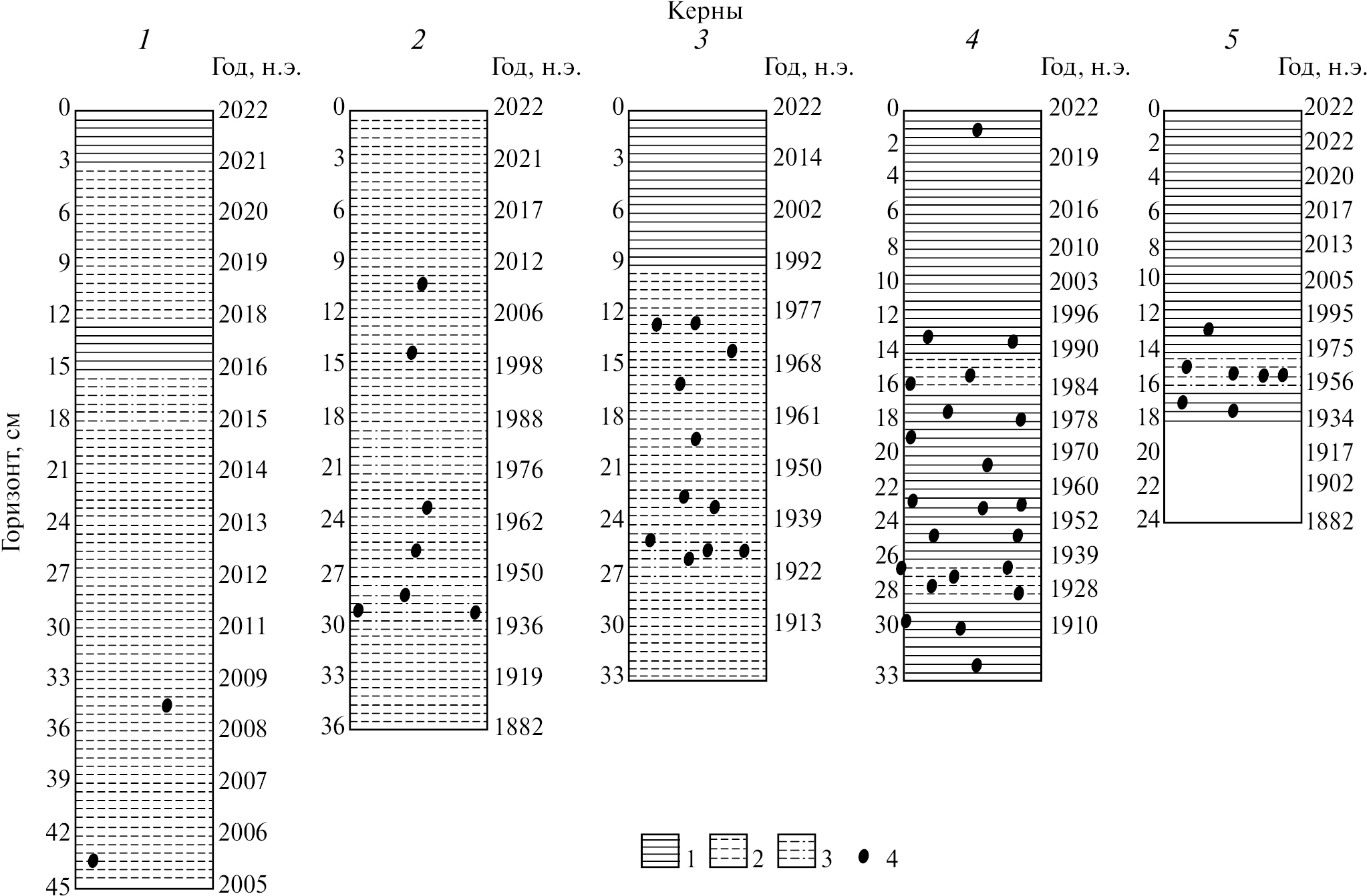 Скорость седиментации в точке 4 существенно менялась в зависимости от периодов формирования осадочных слоев. С 1910 по 1939 гг. она варьировала незначительно – от 0.11 до 0.18 см/год. Плавное увеличение показателя наблюдалось в 1952–1978 гг. до 0.26 см/год, в 1978–2016 гг. до 0.38 см/год. Далее темпы седиментации стремительно повышались, в 2016–2019 г. до 0.8 см/год. К 2022 г. скорость осадконакопления достигла максимального значения 1.83 см/год.