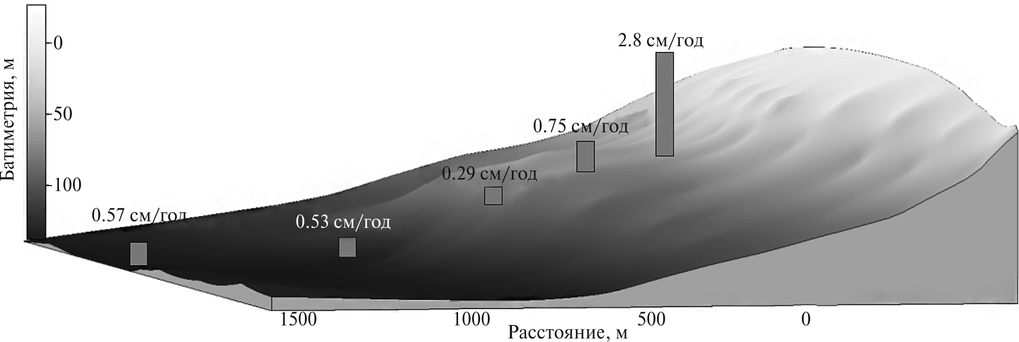 Динамика изменения скорости осадконакопления в периодах, определенных по 210Pb, представлена на рис. 4. Скорость современного осадконакопления в точке 1 составляет 2.8 см/год, высокое значение этого показателя обусловлено расположением точки отбора вблизи устья р. Грёндален (200 м), где происходит лавинная поставка осадочного материала с территории водосбора.