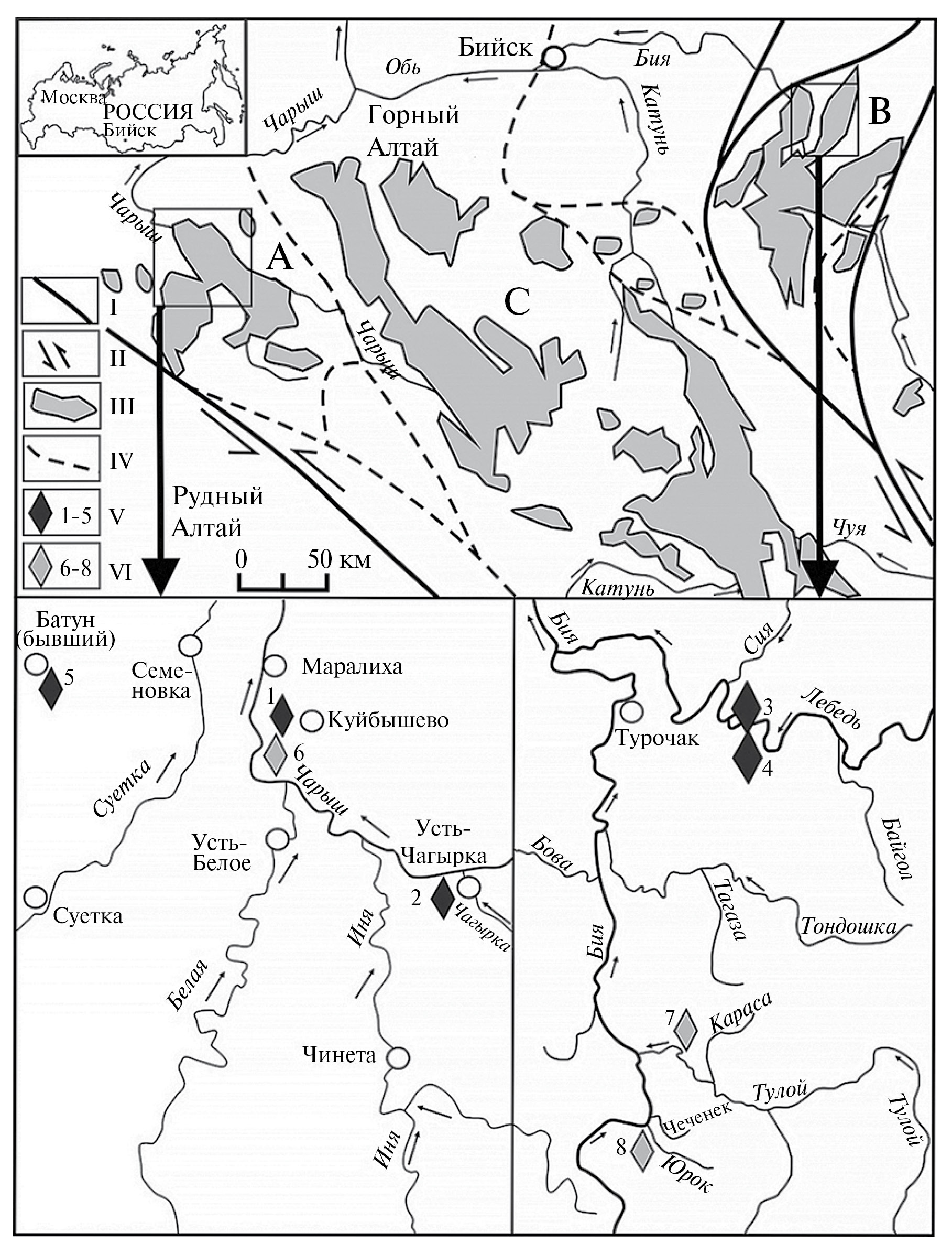 I – глубинные разломы, ограничения крупнейших региональных блоков; II – зоны главных сдвигов; III – поля выходов ордовика; IV – границы между структурно-фациальными зонами (СФЗ) (A – Чарышско-Инская, B – Уйменско-Лебедская, C – Ануйско-Чуйская СФЗ); V – разрезы с новыми (2020-2023 гг.) и переинтерпретированными данными, рассматриваемые в настоящей работе: 1 – Маралиха, 2 – Бараний-1, 3 – Лебедь-Стретинка, 4 – Придорожный, 5 – Батун; VI – разрезы, сведения по которым опубликованы авторами ранее: 6 – Пичужиха, 7 – Тулой, 8 – Юрок.