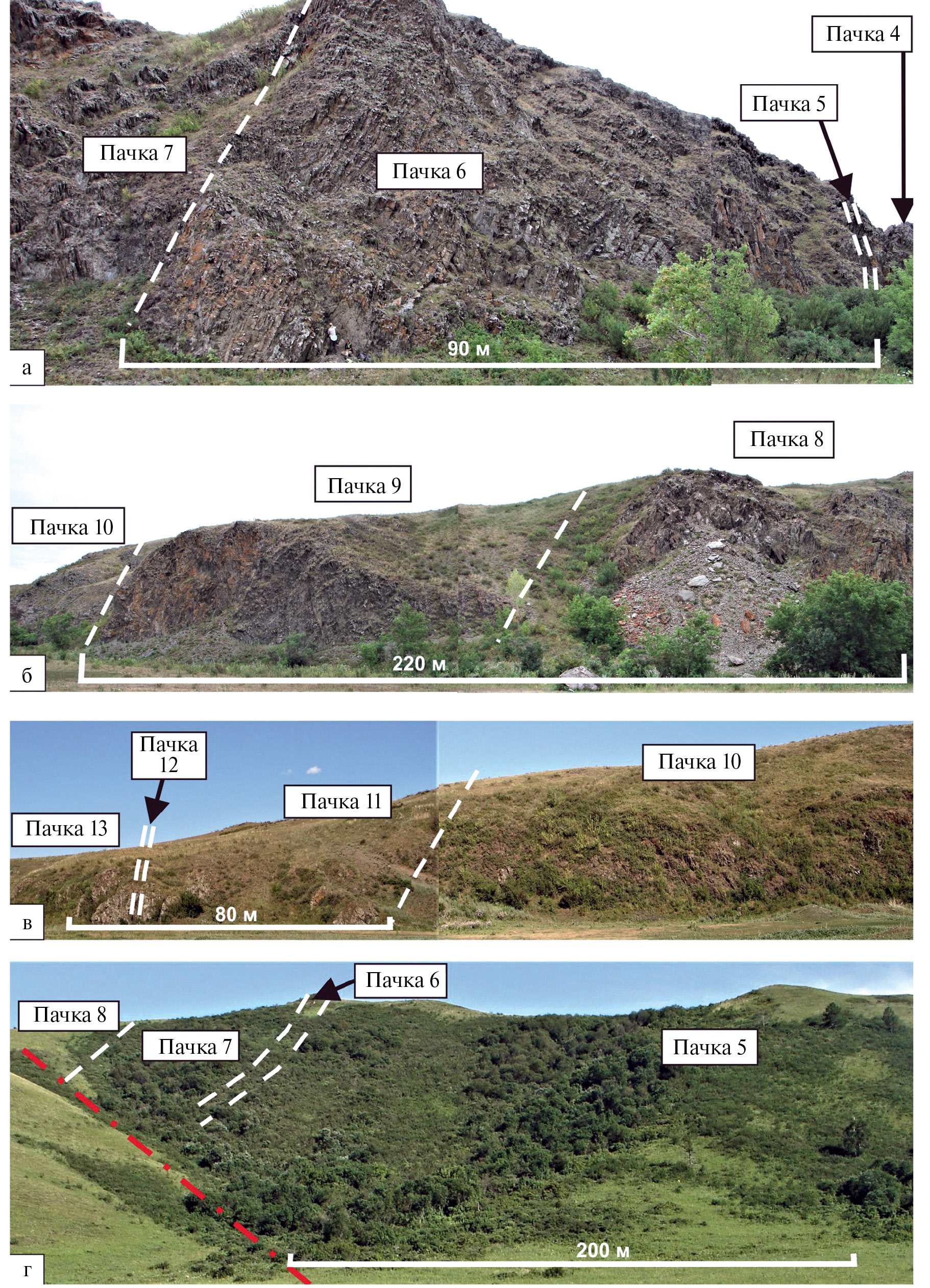 а–в – разрез Маралиха: а – нижняя часть, б – средняя часть, в – верхняя часть; г – разрез Бараний-1 (средняя и верхняя части).