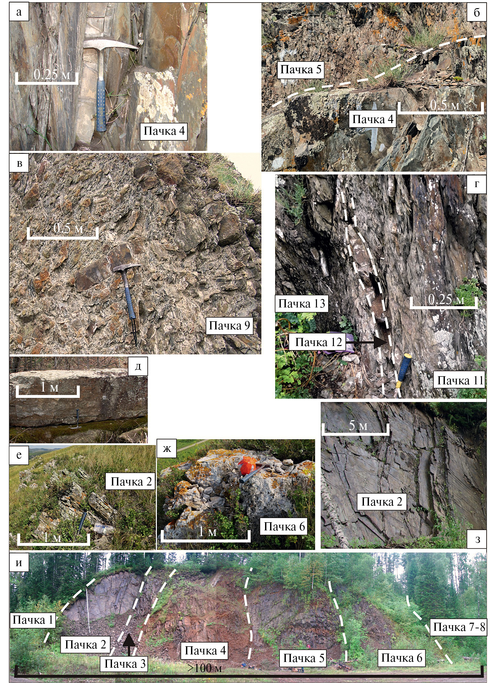 а–г – разрез Маралиха: а – ритмичное переслаивание песчаников и аргиллитов, б – заполнение линзовидной промоины грубообломочным материалом, в – обломки и “закрутыши” нелитифицированных слоев песчаников в песчаном матриксе, г – маломощная пачка линзовидной формы брахиоподового ракушняка среди песчаниковых пачек; д – разрез Тулой, базальная пачка грубослоистых песчаников стратотипа карасинской свиты баровой природы; е, ж – разрез Бараний: е – плитчатые песчаники и гравелиты нижней части разреза, ж – массивные известняки верхней части разреза; з, и – разрез Придорожный: з – идеально ровные поверхности глубоководных аргиллитов, и – панорама.