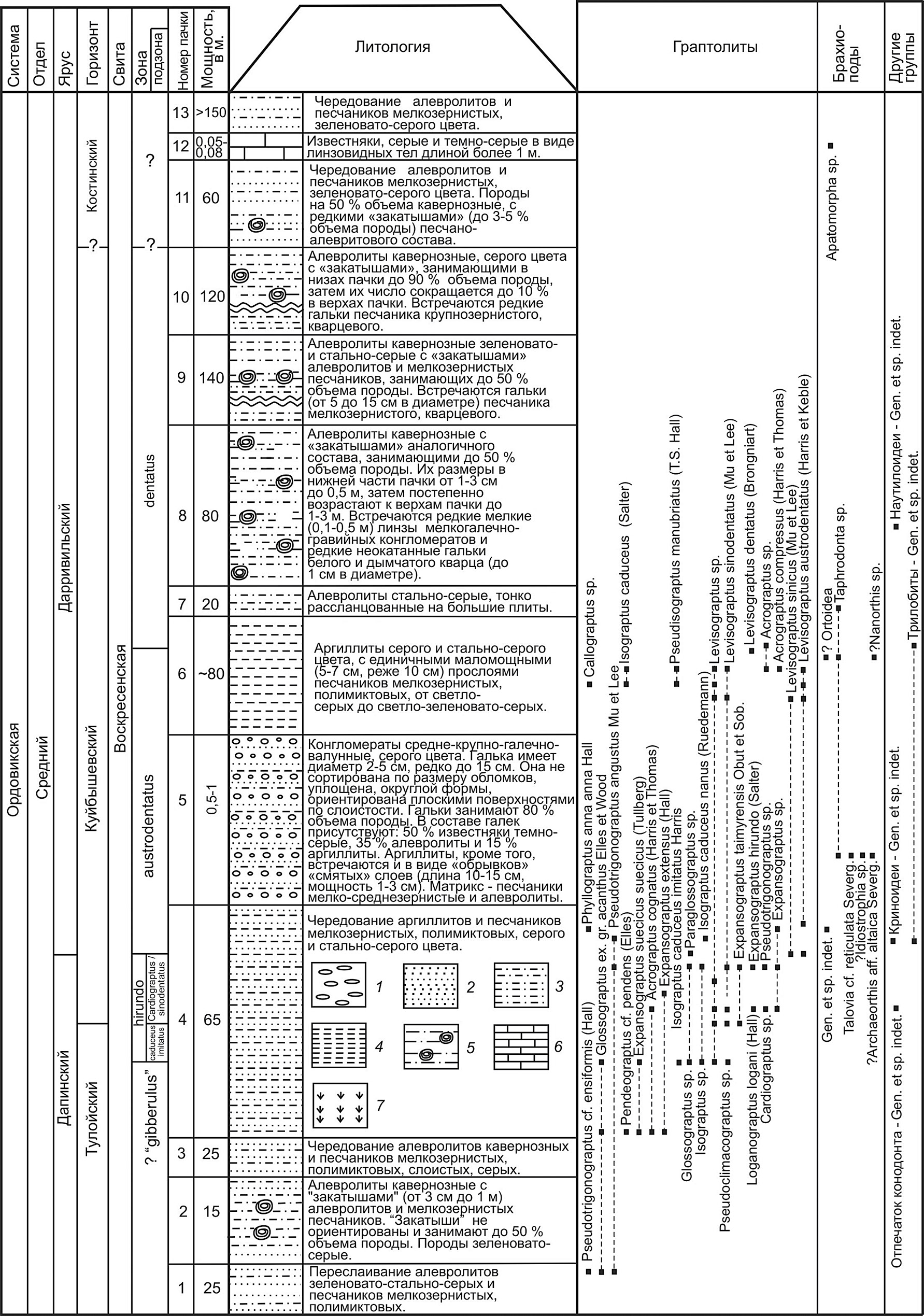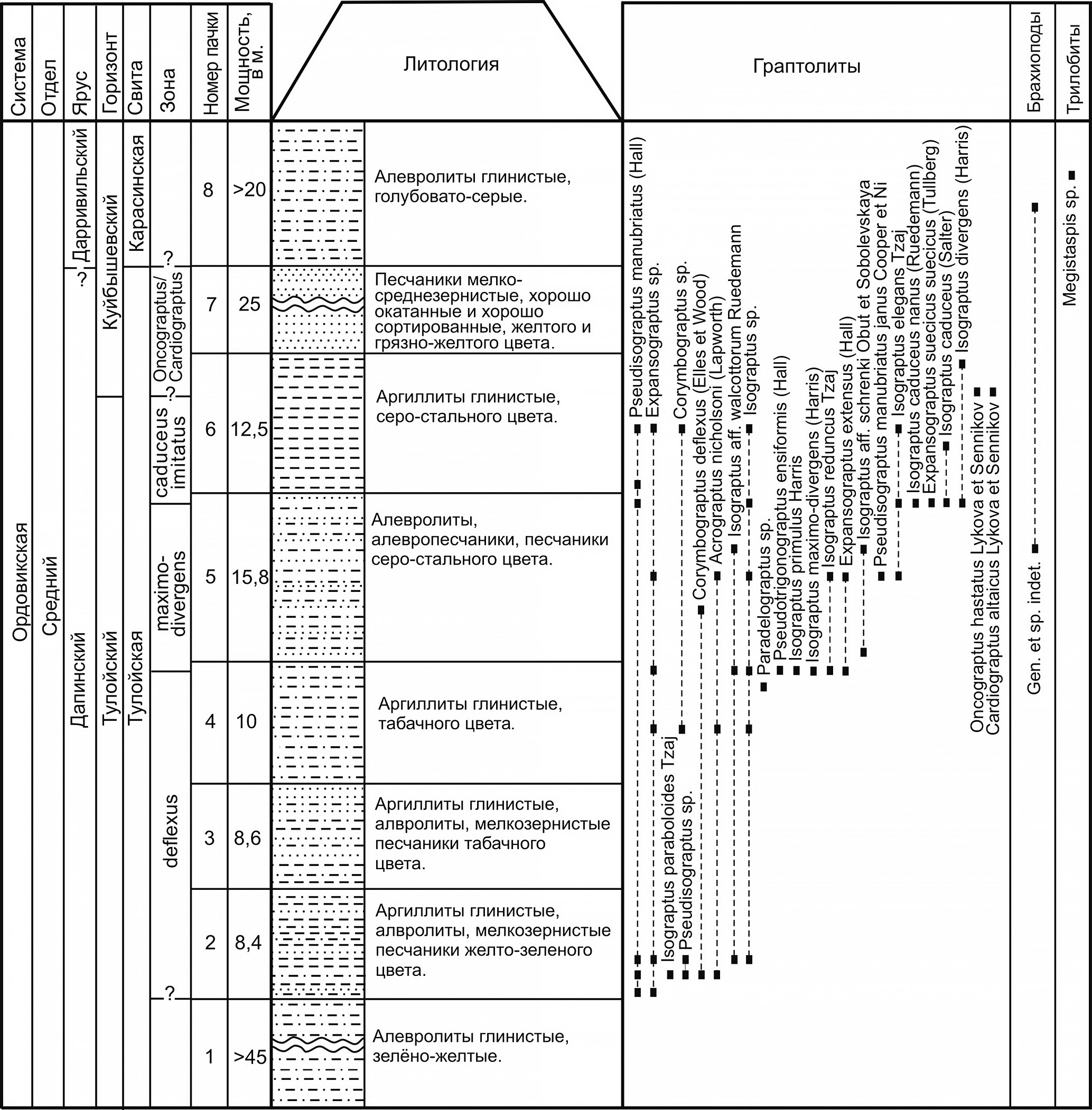 Выделение в Международной стратиграфической шкале ордовика в качестве маркера нижней границы дарривильского яруса вида Levisograptus austrodentatus (Harris et Keble) (Mitchell et al., 1997) поставило перед необходимостью пересмотреть ранее известную ордовикскую граптолитовую шкалу Горного Алтая этого интервала (Сенников, 1996). Новые граптолитовые ордовикские зональные последовательности различных геологических регионов мира (Zalasiewicz et al., 2009; Loydell, 2012) показали возможность более дробного детального расчленения пограничных интервалов дапинского и дарривильского ярусов. С учетом этих материалов в рассматриваемом стратиграфическом интервале для ордовика Горного Алтая была построена новая зональная граптолитовая последовательность: deflexus – maximo-divergens – caduceus imitatus – sinodentatus/Oncograptus – austrodentatus – dentatus (Sennikov et al., 2008; Сенников и др., 2009; Сенников, 2013; Буколова, 2011). Необходимо обратить внимание на то, что если ранее ордовикские граптолитовые зоны как в России, так и в других странах принимались как комплексные зоны, то в настоящее время большинство граптолитовых зон среднего ордовика можно классифицировать как “интервал-зоны” (Стратиграфический…, 2019, с. 35): “слои, заключенные между первым появлением какого-либо характерного таксона (обычно вида-индекса) данной зоны и первым появлением характерного таксона (обычно вида-индекса) вышележащей зоны”. В то же время при характеристике таких среднеордовикских граптолитовых зон приводится сопровождающий комплекс других таксонов граптолитов (Zalasiewicz et al., 2009; Albanesi, Ortega, 2016; Mango et al., 2018).