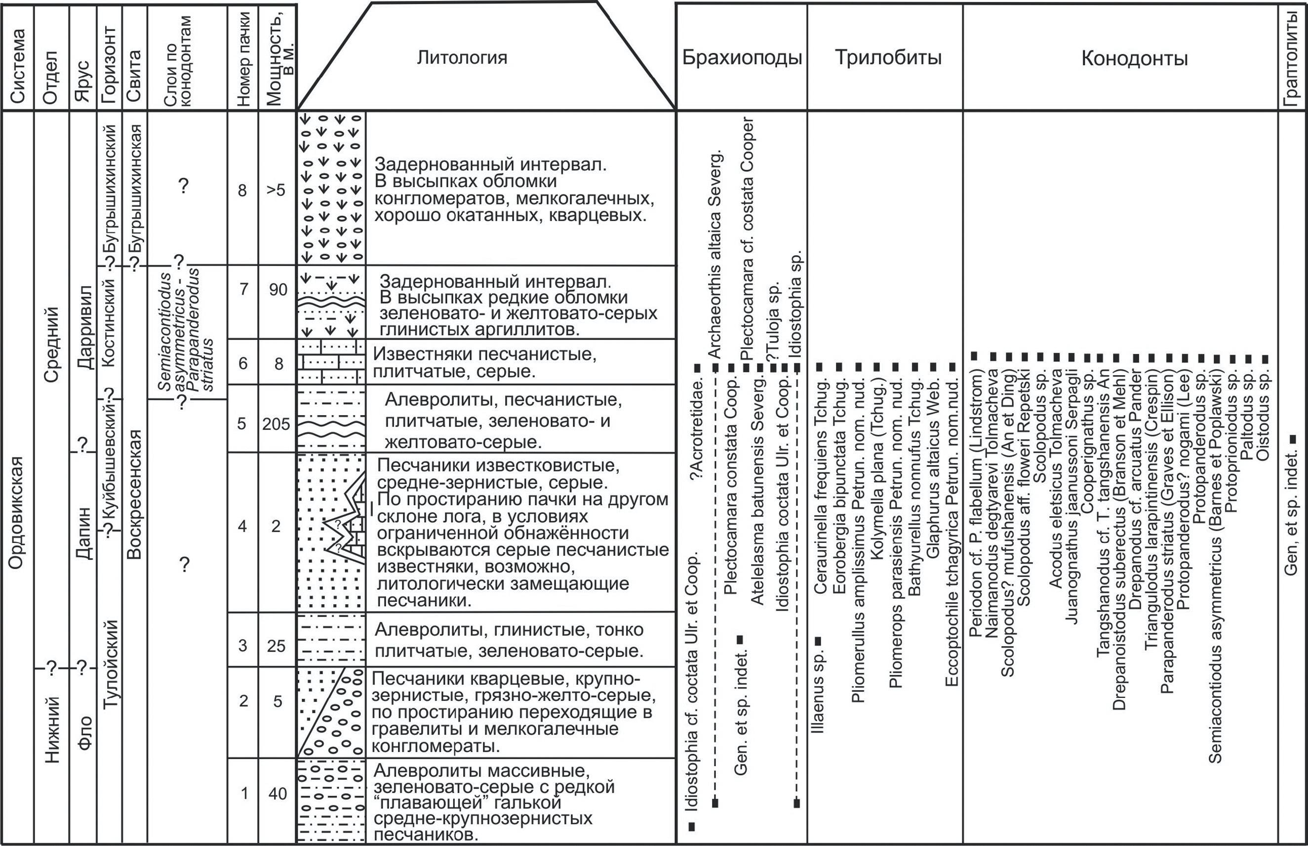 Как уже отмечалось выше, в стратиграфическом интервале среднего ордовика в регионе выделяются следующие местные стратоны: воскресенская (верхняя половина) и бугрышихинская (нижняя половина) свиты в объединенной Чарышско-Чуйской СФЗ (Чарышско-Инская + Ануйско-Чуйская); тулойская (верхняя треть) и карасинская (весь объем) свиты в Уйменско-Лебедской СФЗ (Решения…, 1983; Сенников и др., 2018). Все перечисленные свиты сложены исключительно терригенными образованиями – конгломератами и грубозернистыми песчаниками (в виде базальных пачек), мелко-среднезернистыми песчаниками, алевролитами и аргиллитами (Петрунина и др., 1984; Сенников и др., 2018). Карбонатные породы в виде линзовидных прослоев известняков в дапинско-дарривильском стратиграфическом интервале встречены на Алтае пока только в верхах воскресенской свиты – так называемые костинские слои в разрезах Бараний-1 (рис. 2, 3, 5) и Батун (рис. 8) (Левицкий, 1963; Сенников и др., 1982; Петрунина и др., 1984), а также в разрезе Маралиха (рис. 2, 3, 4, 5).