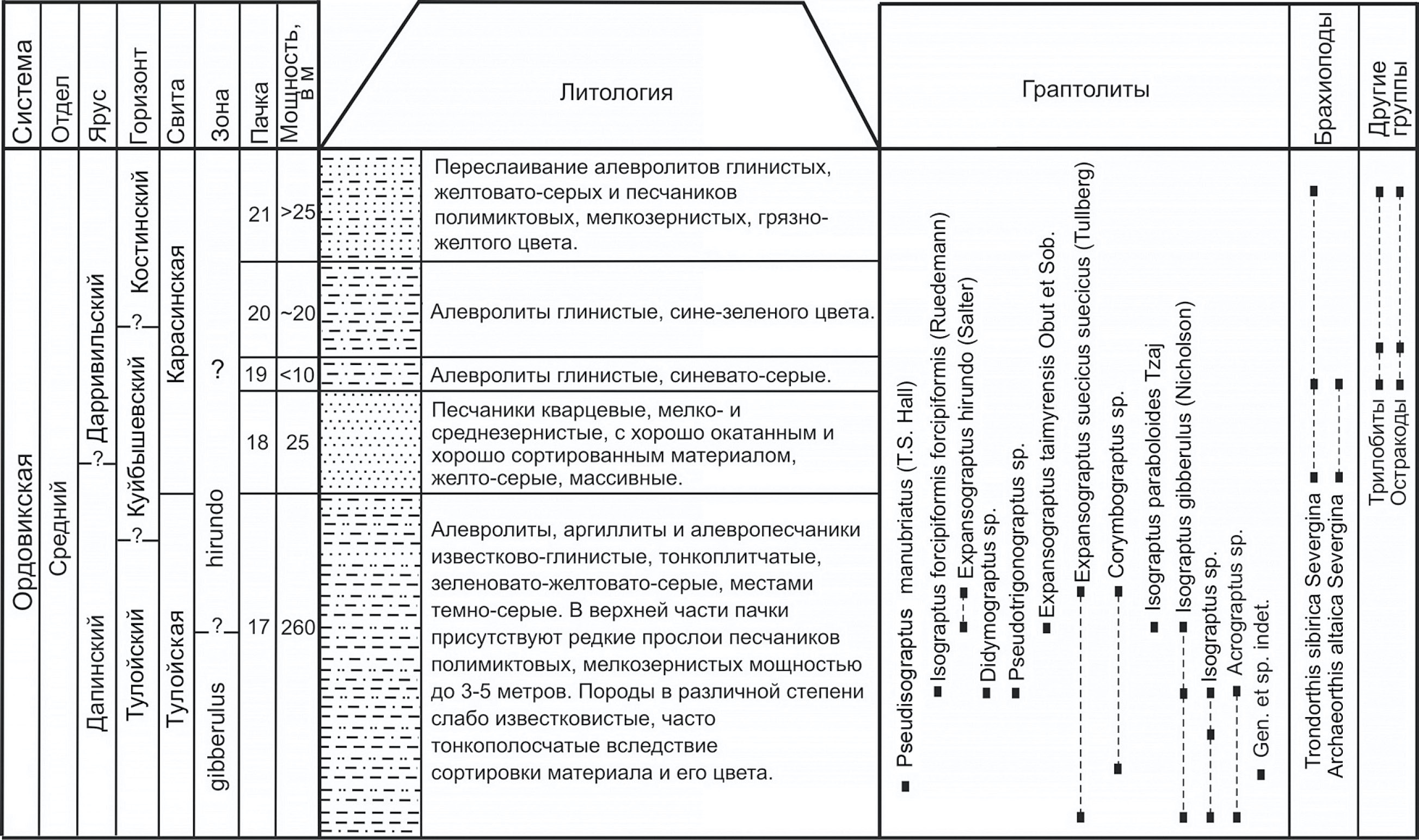 Вклады авторов. Граптолиты изучались Н.В. Сенниковым и Е.В. Лыковой, конодонты – О.Т. Обут и Н.Г. Изох, трилобиты – А.В. Тимохиным (собственные материалы с пересмотром определений З.Е. Петруниной), брахиоподы – Т.А. Щербаненко (собственные материалы с пересмотром определений и коллекций Л.Г. Севергиной).