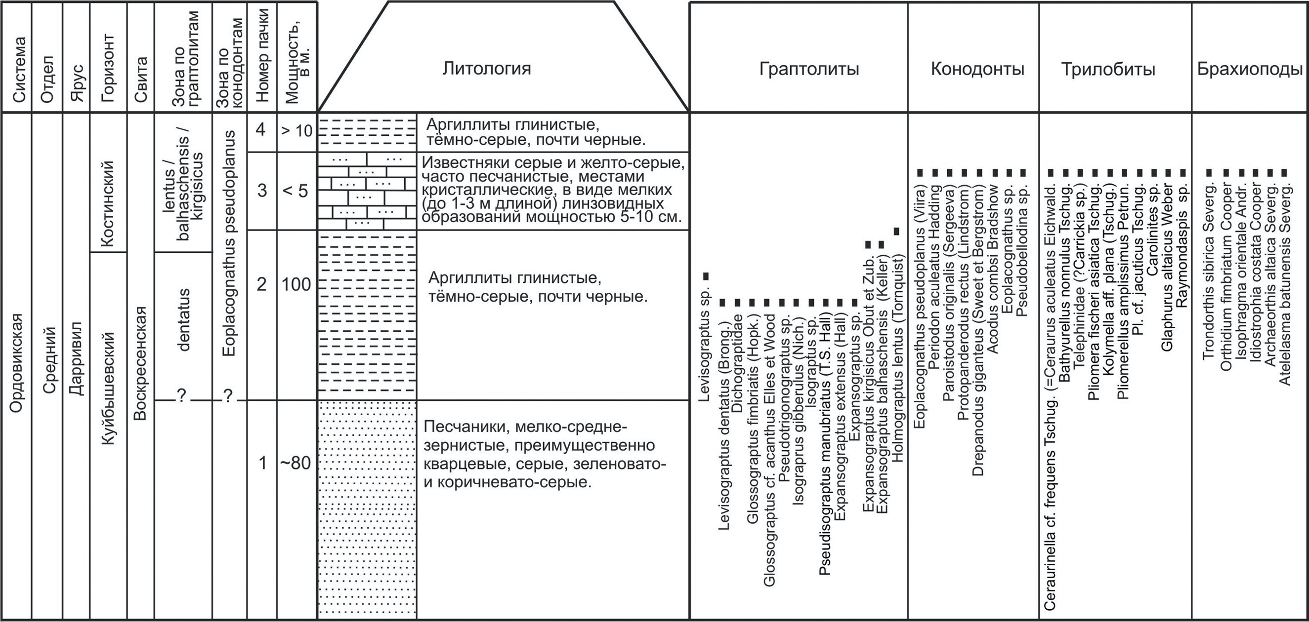 Допуская существование двух карбонатных уровней, хроностратиграфический интервал костинского горизонта был в целом сопоставлен с интервалом двух граптолитовых зон – dentatus и kirgisicus/balhaschensis, подстилаемых и перекрываемых известняками с трилобитами и брахиоподами. В настоящее время авторы статьи, на основе детального переизучения структурного положения выходов пород на Батунском (= Костинско-рудниковском) участке, склоняются к выводу, что там вскрывается только один карбонатный уровень. Таким образом, не получает документального подтверждения предложение об отнесении костинского горизонта к стратиграфическому интервалу двух граптолитовых зон (см. выше). Терригенная граптолитсодержащая пачка разреза Батун подстилает карбонатные породы с костинскими трилобитово-брахиоподовыми комплексами. Напомним, что в верхах разреза Маралиха, в стратотипе куйбышевского горизонта, найдены граптолиты зоны dentatus, которую авторы настоящей статьи относят к верхам куйбышевского горизонта. В связи с этим костинский горизонт с его давно известными фаунистическими бентосными сообществами (Левицкий, 1963; Севергина, 1973; Кульков, Севергина, 1989) должен отвечать только одной (более молодой из двух отмеченных выше) граптолитовой зоне – lentus/kirgisicus/balhaschensis. Граптолиты этой зоны в разрезе Маралиха, в стратотипе куйбышевского горизонта, пока не известны.