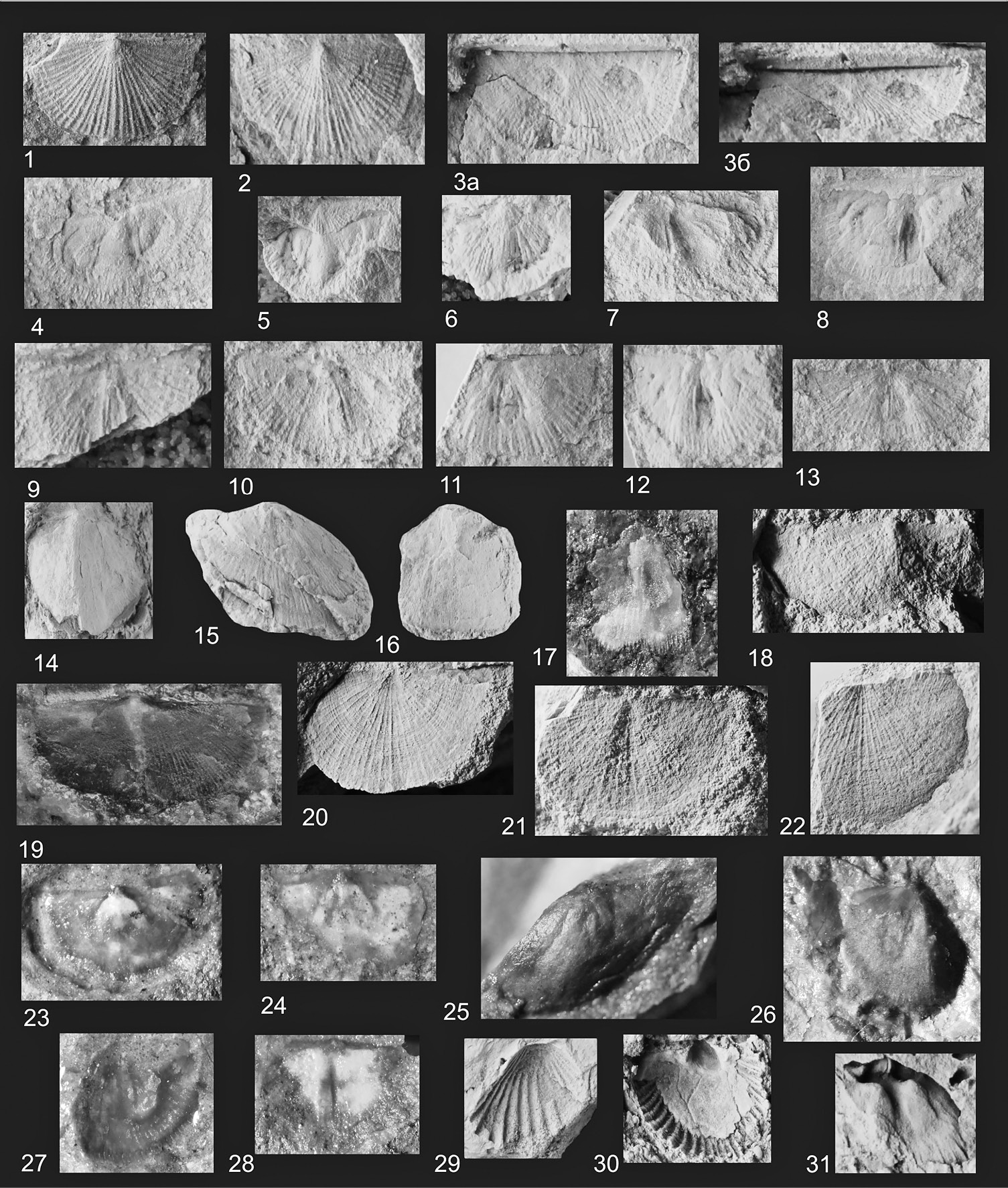 1–13 – Taphrodonta sp.: 1 – брюшная створка, экз. 2121/17, обр. Щ2304-1, 5-я пачка, нижняя часть; 2 – брюшная створка, экз. 2121/18, обр. Щ2101-7/2, 7-я пачка (8 м от основания); 3a – отпечаток спинной створки, 3б – ареи брюшной и спинной створок, экз. 2121/19, обр. Щ2204-2, 5-я пачка, нижняя часть; 4 – ядро брюшной створки, экз. 2121/20, обр. Щ2101-7/2, 7-я пачка (8 м от основания); 5 – ядро брюшной створки, экз. 2121/21, обр. Щ2101-7/2, 7-я пачка (8 м от основания); 6 – ядро брюшной створки, экз. 2121/22, обр. Щ2204-1, 7-я пачка (8 м от основания); 7 – внутреннее строение брюшной створки, экз. 2121/23, обр. Щ2101-7/2, 7-я пачка (8 м от основания); 8 – ядро спинной створки, экз. 2121/24, обр. Щ2101-7/2, 7-я пачка (8 м от основания); 9 – внутреннее строение спинной створки, экз. 2121/25, обр. Щ2101-7/2, 7-я пачка (8 м от основания); 10 – внутреннее строение спинной створки, экз. 2121/26, обр. Щ2101-7/2, 7-я пачка (8 м от основания); 11 – ядро спинной створки, экз. 2121/27, обр. Щ2101-7/2, 7-я пачка (8 м от основания); 12 – ядро спинной створки, экз. 2121/28, обр. Щ2101-7/2, 7-я пачка (8 м от основания); 13 – ядро спинной створки, с фрагментом срединной септы, экз. 2121/29, обр. Щ2101-7/2, 7-я пачка (8 м от основания); все ×4, кроме фиг. 1, ×3; 14–17 – Talovia cf. reticulata Severg.: 14 – брюшная створка, экз. 2121/30, обр. Щ2101-5, 5-я пачка, нижняя часть; 15 – брюшная створка, экз. 2121/31, обр. Щ2101-5, нижняя часть 5-й пачки; 16 – брюшная створка, экз. 2121/32, обр. Щ2304-1, нижняя часть 5-й пачки; 17 – фрагмент створки, экз. 2121/33, обр. Щ2304-1, нижняя часть 5-й пачки; все ×3, кроме фиг. 14, ×2; 18–28 – Apatomorpha sp.: 18 – брюшная створка, экз. 2121/34; 19 – брюшная створка, экз. 2121/35; 20 – спинная створка, экз. 2121/36; 21 – спинная створка, экз. 2121/37; 22 – спинная створка, экз. 2121/38; 23 – внутреннее строение брюшной створки, экз. 2121/39; 24 – внутреннее строение брюшной створки, экз. 2121/40; 25 – внутреннее строение брюшной створки, экз. 2121/41; 26 – внутреннее строение брюшной створки, экз. 2121/42; 27 – внутреннее строение брюшной створки, экз. 2121/43; 28 – внутреннее строение спинной створки, экз. 2121/44; все экземпляры происходят из обр. Щ2102-3, 12-я пачка; все ×3, кроме фиг. 26, 27, ×2; 29 – ? Idiostrophia sp., отпечаток створки, экз. 2121/45, обр. Щ2304-1, нижняя часть 5-й пачки, ×3; 30 – ? Nanorthis sp., внутреннее строение брюшной створки, экз. 2121/46, обр. Щ2204-3, 6-я пачка (60 м от основания), ×3; 31 – ? Archaeorthis aff. altaica Severg., ядро спинной створки, наблюдается замочный отросток, экз. 2121/47, обр. Щ2204-2, нижняя часть 5-й пачки, ×5.
