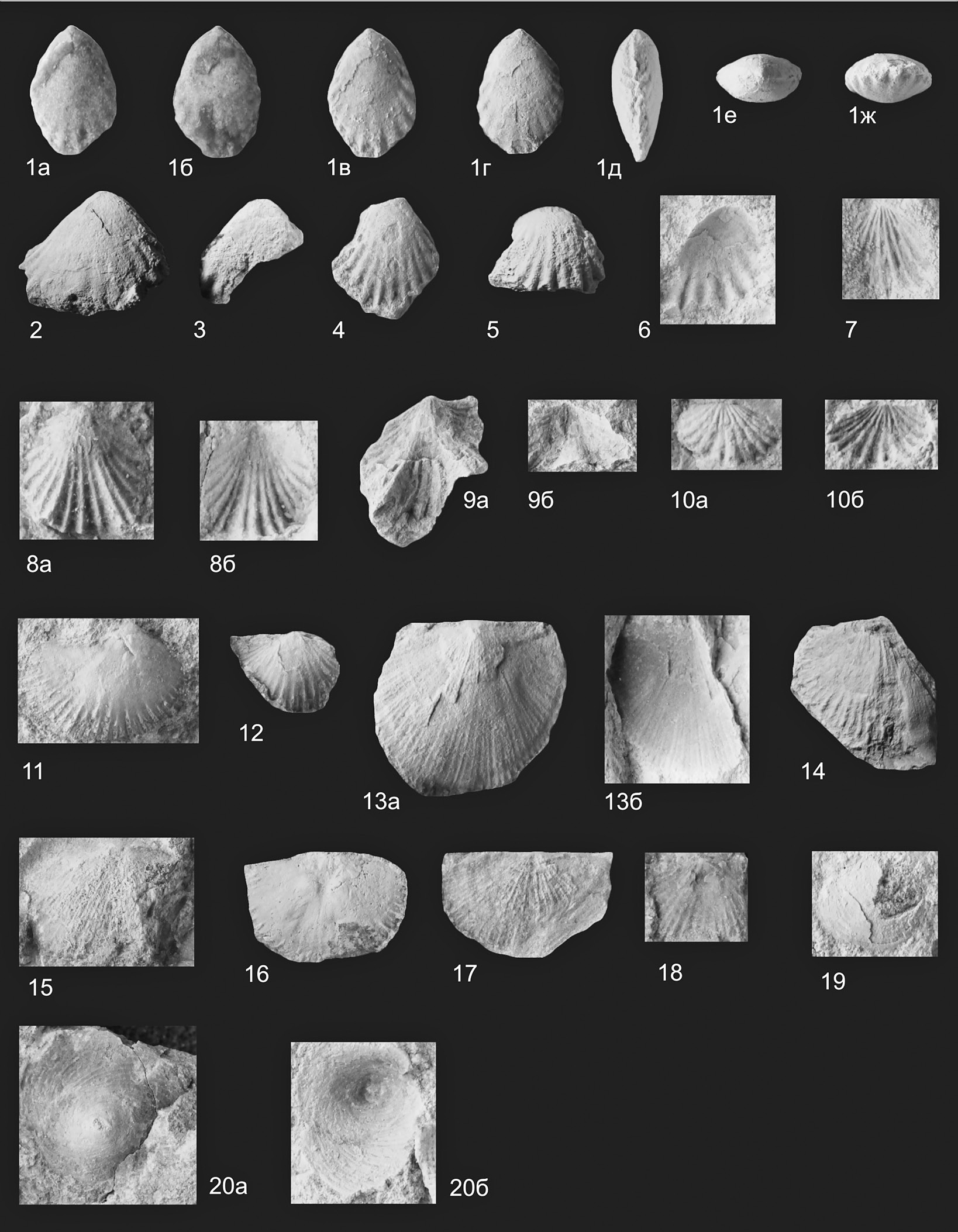 1–6 – Idiostrophia costata Ulr. et Coop.: 1 – целая раковина со слущенным раковинным веществом, экз. 2121/48: 1a – брюшная створка, без напыления, виден узкий спондилий и срединная септа; 1б – спинная створка, без напыления, наблюдается срединная септа и фрагмент брахиофория; 1в – брюшная створка; 1г – спинная створка; 1д – вид сбоку; 1е – замочный край; 1ж – передняя комиссура; 2 – брюшная створка, экз. 2121/49; 3 – брюшная створка, экз. 2121/50; 4 – брюшная створка, экз. 2121/51; 5 – фрагмент брюшной створки, примакушечная область отсутствует, экз. 2121/52; 6 – отпечаток брюшной створки, экз. 2121/53; все ×3; 7 – ? Idiostrophia sp., отпечаток створки, экз. 2121/54, ×4; 8–10 – Plectocamara cf. costata Cooper: 8a – брюшная створка, экз. 2121/55, 8б – отпечаток брюшной створки, экз. 2121/56, ×4; 9a – брюшная створка, экз. 2121/57, 9б – отпечаток брюшной створки, экз. 2121/58, ×3; 10a – спинная створка, экз. 2121/59, 10б – отпечаток спинной створки, экз. 2121/60, ×4; 11–18 – Atelelasma batunensis Severg.: 11 – брюшная створка, экз. 2121/61; 12 – брюшная створка, экз. 2121/62; 13a – брюшная створка, экз. 2121/63, 13б – отпечаток брюшной створки, экз. 2121/64; 14 – брюшная створка, экз. 2121/65; 15 – спинная створка, экз. 2121/66; 16 – ядро спинной створки, экз. 2121/67; 17 – спинная створка, экз. 2121/68; 18 – спинная створка, экз. 2121/69; все ×3; 19 – ? Tuloja sp., фрагмент створки с частично сохранившимся раковинным веществом, видна концентрическая скульптура, экз. 2121/70, ×4; 20 – ? Acrotretidae: 20a – брюшная створка, экз. 2121/71, 20б – отпечаток брюшной створки, экз. 2121/72; все ×3. Все образцы из 6-й пачки.