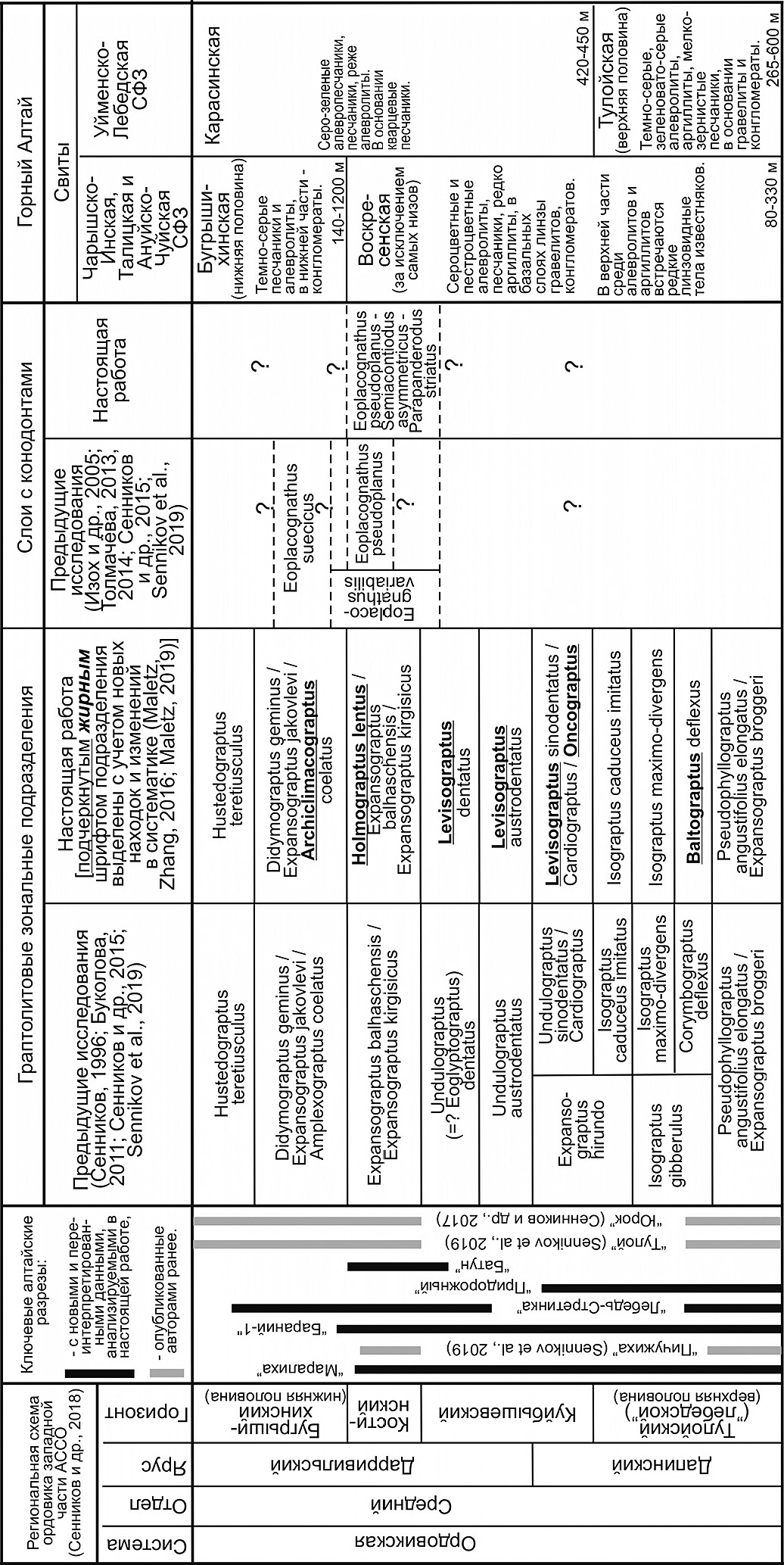 Рис. 9. Современные представления о взаимоотношениях границ региональных стратонов среднего ордовика Горного Алтая с границами зональных подразделений по граптолитам и конодонтам.