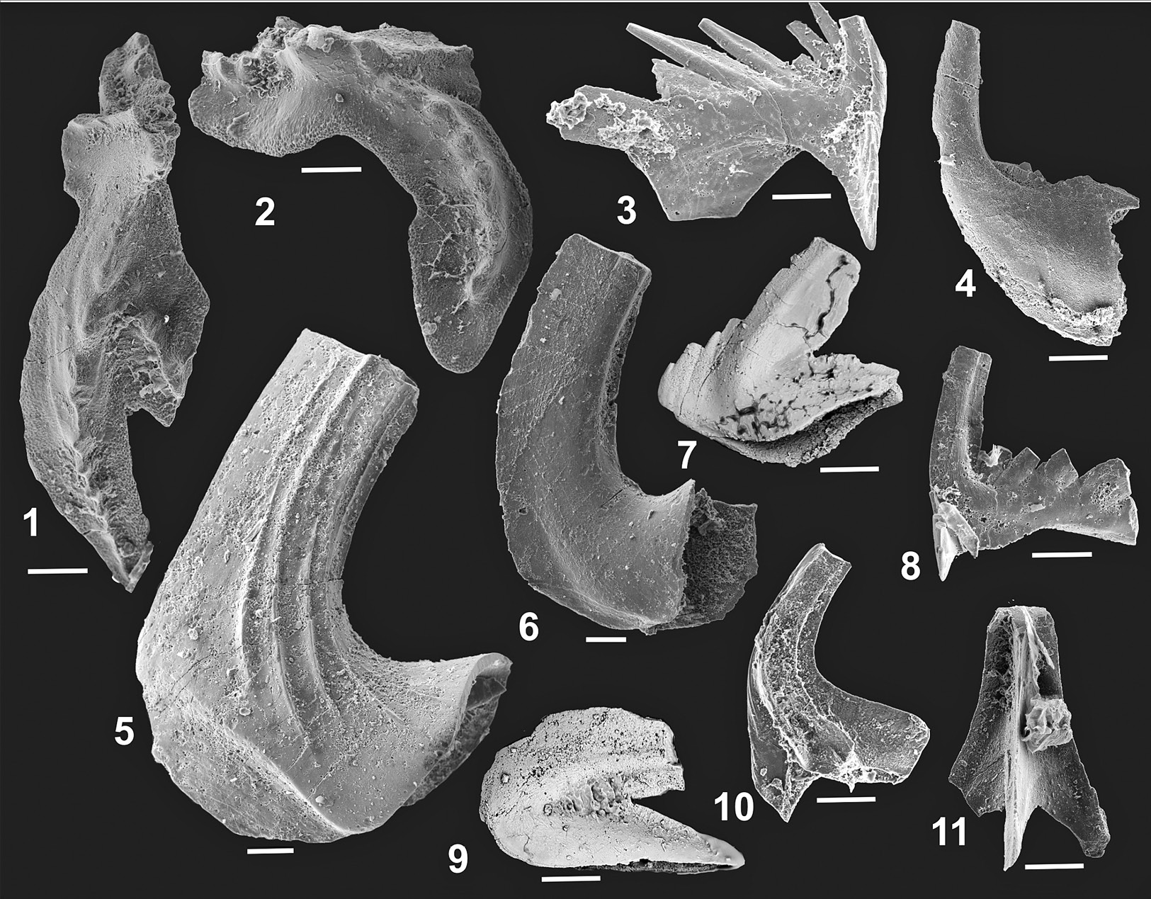 1, 2 – Eoplacognathus pseudoplanus (Viira), Р-элементы: 1 – экз. 2121/73, 2 – экз. 2121/74; 3, 7, 8 – Periodon aculeatus Hadding: 3 – S-элемент, экз. 2121/75, 7 – M-элемент, экз. 2121/76, 8 – S-элемент, экз. 2121/77; 4 – Pseudobelodina sp., экз. 2121/78; 5 – Drepanodus giganteus (Sweet et Bergstrom), асимметричный элемент, экз. 2121/79; 6 – Protopanderodus rectus (Lindstrom), экз. 2121/80; 9 – Paroistodus originalis (Sergeeva), М-элемент, экз. 2121/81; 10, 11 – Acodus cf. A. emanuelensis McTavish, S-элементы: 10 – экз. 2121/82, 11 – экз. 2121/83. Длина масштабной линейки 100 мкм.