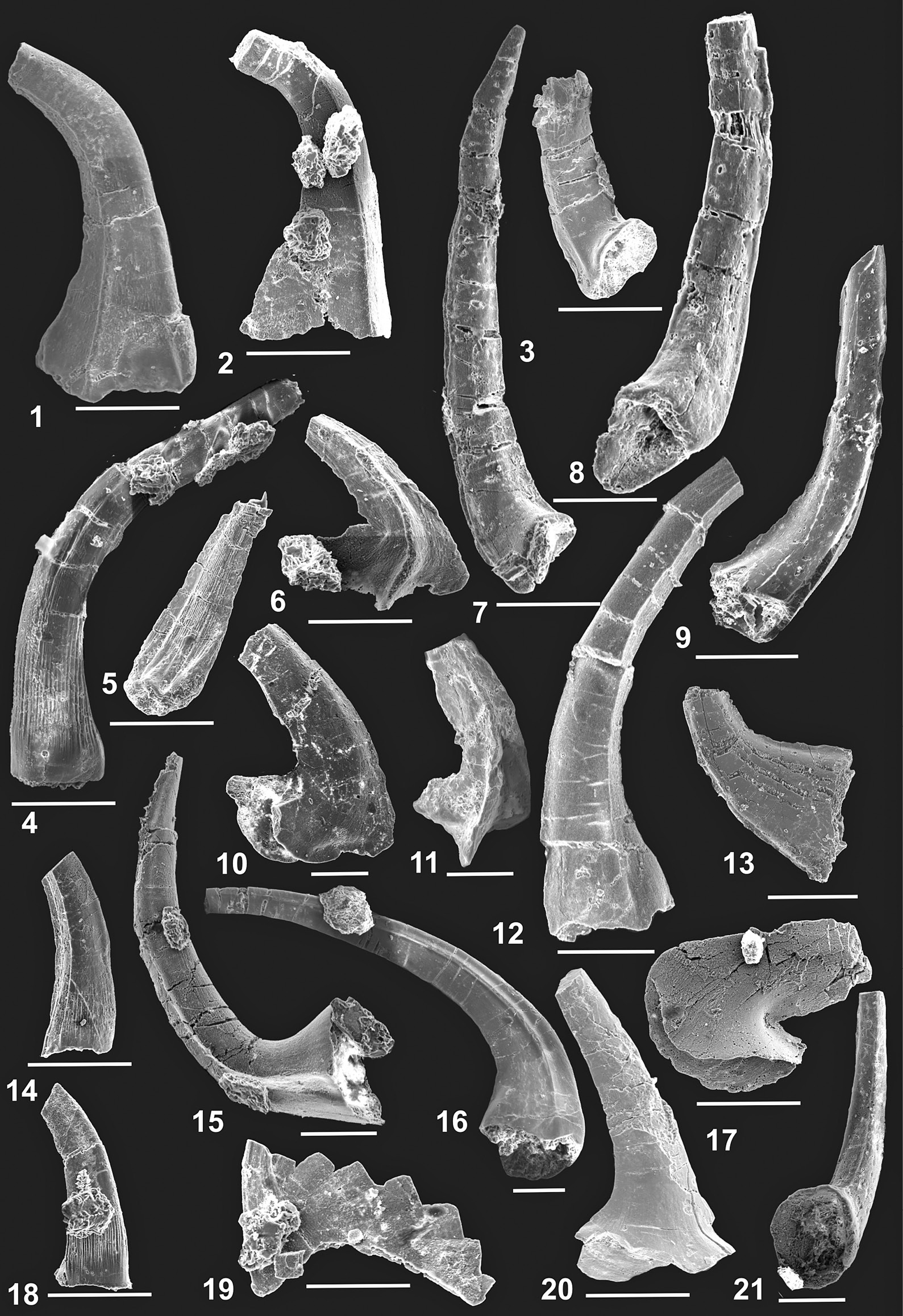 1, 2 – Acodus cf. eletsicus Tolmacheva, Sd-элементы: 1 – экз. 2121/84, 2 – экз. 2121/85; 3, 7, 8 – Juanognathus janussoni Serpagli, асимметричные элементы, вид сзади: 3 – экз. 2121/69, 7 – экз. 2121/87, 8 – экз. 2121/88; 4 – Parapanderodus striatus (Graves et Ellison), S-элемент, экз. 2121/89; 5 – Semiacontiodus asymmetricus (Barnes et Poplawski), асимметричный элемент, экз. 2121/90; 6 – Oistodus sp., экз. 2121/91; 9, 12, 13, 15 – Triangulodus cf. larapintinensis (Crespin), S-элементы: 9 – экз. 2121/92, 12 – экз. 2121/93, 13 – экз. 2121/94, 15 – экз. 2121/95; 10 – Drepanodus sp., S-элемент, экз. 2121/96; 11 – Triangulodus sp., S-элемент, экз. 2121/97; 14, 18 – Naimanodus degtyarevi Tolmacheva, S-элементы: 14 – экз. 2121/98, 18 – экз. 2121/99; 16, 21 – Scolopodus aff. floweri Repetski, S-элементы: 16 – экз. 2121/100, 21 – экз. 2121/101; 17, 20 – Drepanoistodus basiovalis (Sergeeva): 17 – M-элемент, экз. 2121/102, 20 – S-элемент, экз. 2121/103; 19 – Periodon sp., S-элемент, экз. 2121/104. Длина масштабной линейки 100 мкм.