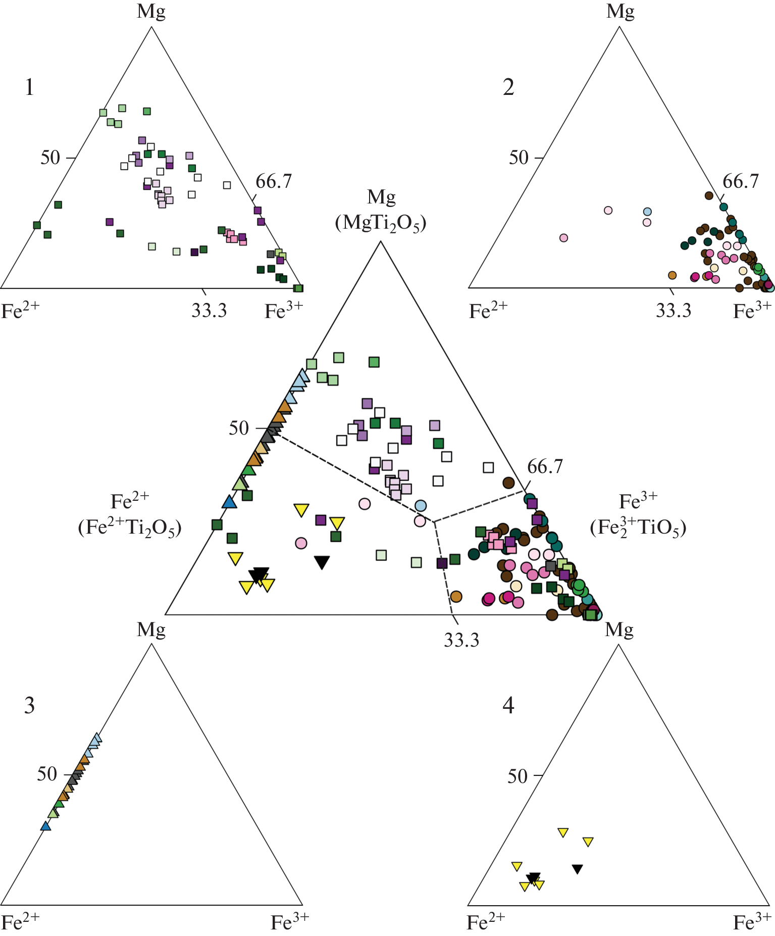 For the first time there is characterized pseudobrookite from deposits of active volcanic fumaroles Arsenatnaya and Yadovitaya of the Tolbachik volcanic massif (Kamchatka). Chemical composition of pseudobrookite-group minerals and isomorphism in these oxides of different origin were studied on the base of 203 analyses (literature data and original analyses of 40 samples) from 44 localities. It is shown that at the near-surface levels pseudobrookite crystallized mainly with composition chemically close to the end-member Fe\(_{2}^{{3 + }}\)TiO5. It is known that lunar rocks contain only minerals of the “ferropseudobrookite” Fe2+Ti2O5 ‒ armalcolite MgTi2O5 series characterized by an intermediate value of the Fe2+:Mg-ratio, the highest Ti content and the absence of Fe3+. Impact minerals and there technogenic analogues are chemically close to Fe2+Ti2O5. Pseudobrookite from Tolbachik fumaroles is characterized by the high Al content (up to 7.1 wt % Al2O3), a stable level of Cu (up to 1.8 wt % CuO) and Sn (up to 1.8 wt % SnO2) admixtures, and, sporadically by the small admixture of Sc (up to 0.3 wt % Sc2O3). Cu and Sn admixtures are indicative features of the pseudobrookite of this genetic type. These elements usually are incorporated into pseudobrookite together, according to the isomorphic scheme Sn4+ + Cu2+ → 2Fe3+, which is revealed for the first time for minerals of this group. Pseudobrookite of Tolbachik fumaroles was formed participating the process of gas–metasomatic alteration of basalt at temperature 500–750 °С. Presumably, Cu and Sn were brought by volcanic gas, while basalt was a source of Ti, Al and Sc; for Fe a source could be mixed.