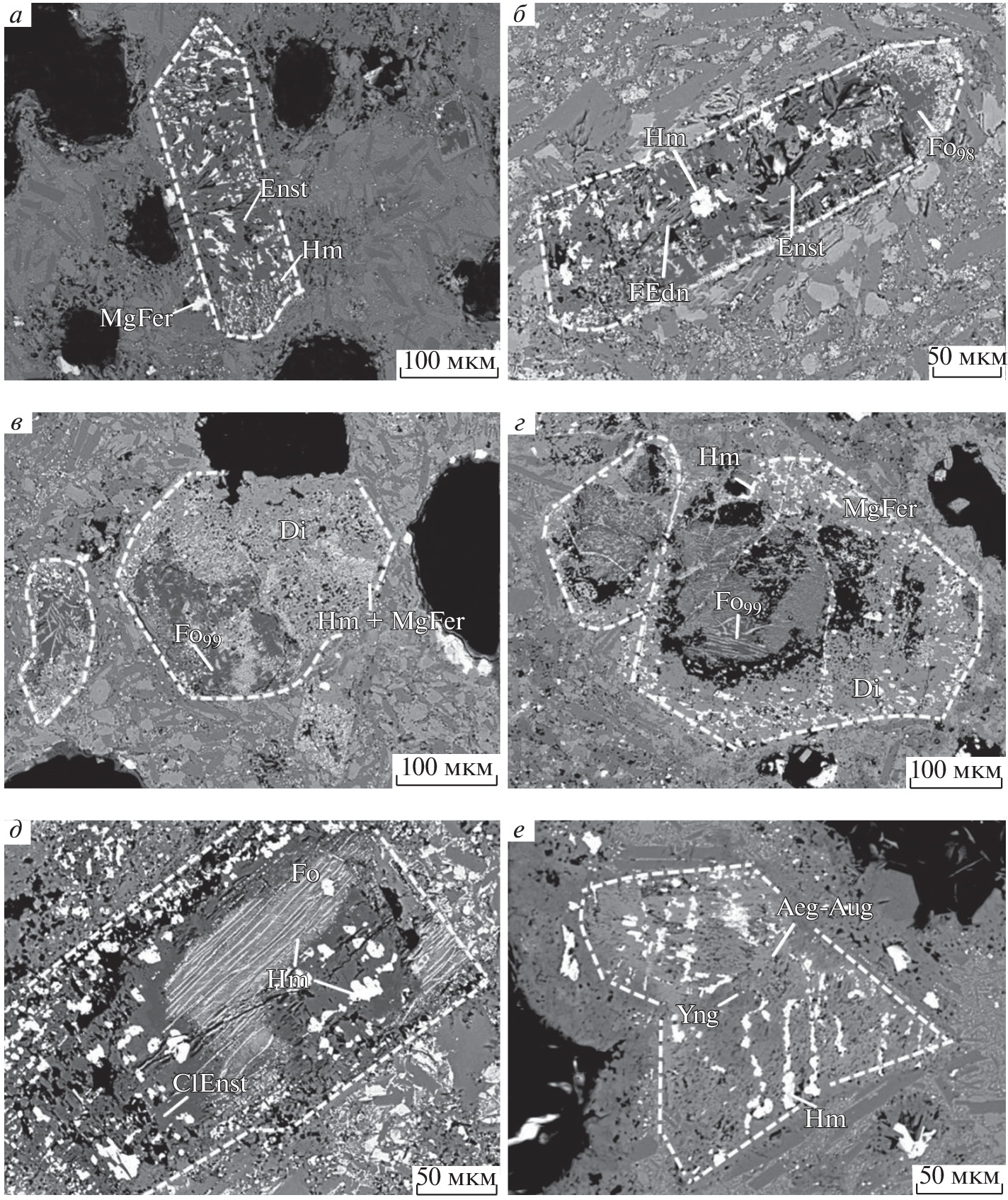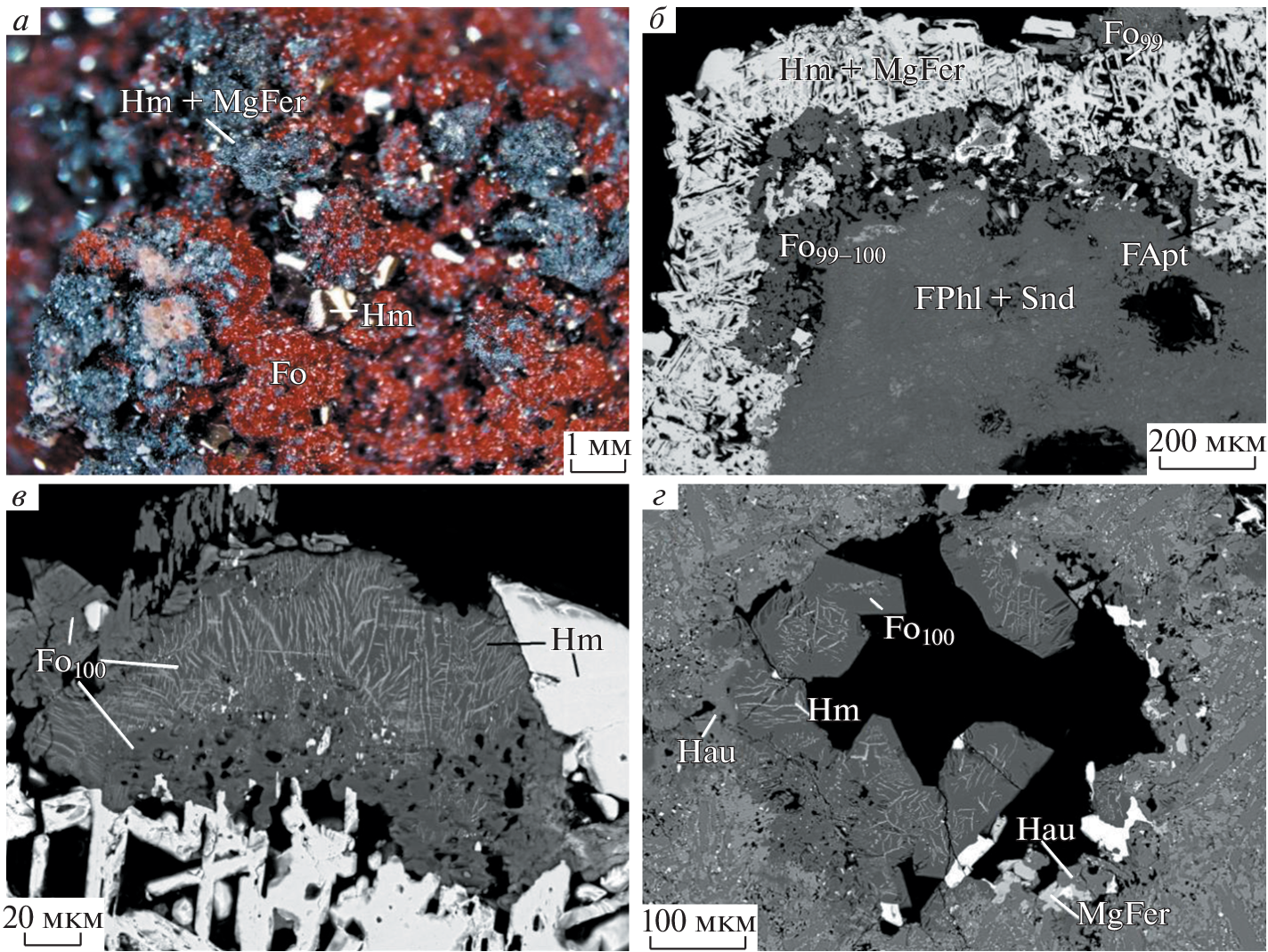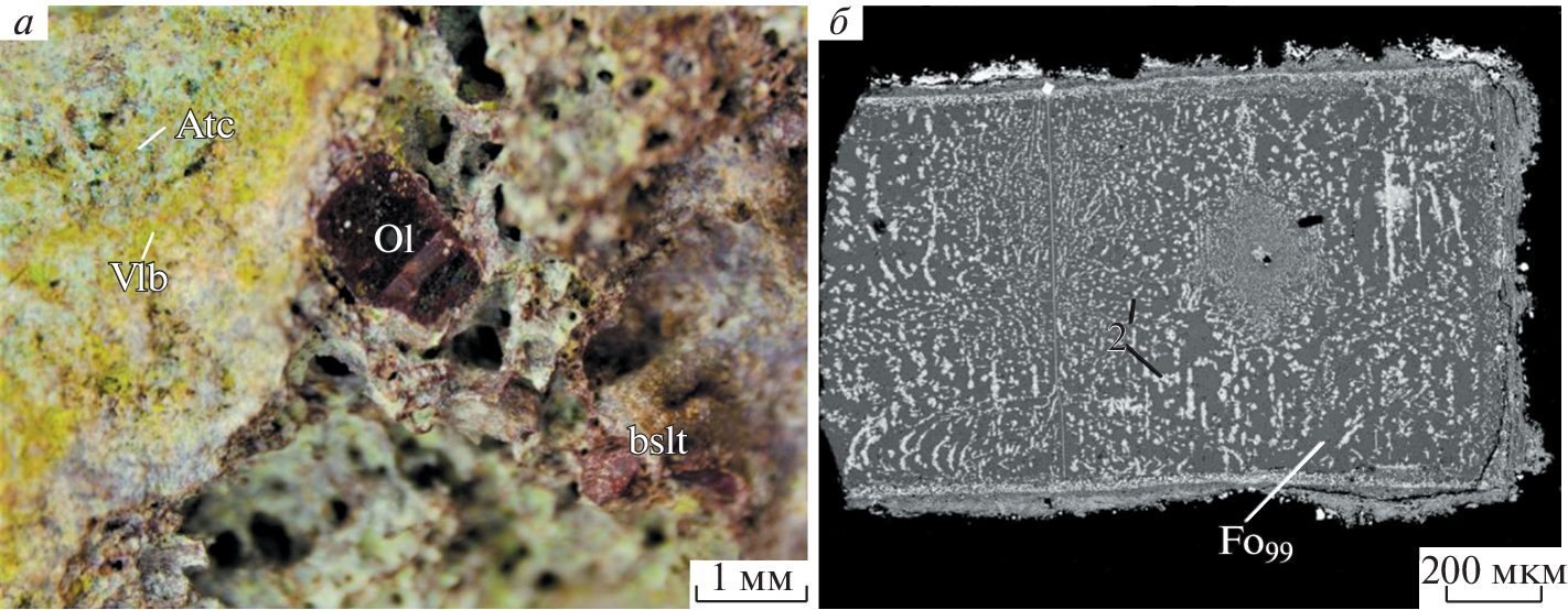 This paper is devoted to the olivine pseudomorphization processes occurring in basalt under the action of high-temperature O2-rich gas in oxidizing-type fumaroles at the Tolbachik volcano (Kamchatka, Russia). The alteration of olivine with composition Fo72–90 in a terraneous oxidizing-type exhalation system involves two independent processes: (1) oxidative breakdown (above 600 °C) with the formation of forsterite Fo90–100 together with hematite, magnesioferrite, and, presumably, “magnesian laihunite”; (2) replacement by mineral aggregates in which pyroxenes [enstatite, clinoenstatite, diopside, aegirine-augite (Ca0.5Na0.5)(Mg0.5Fe0.5)Si2O6], low-alumina fluoromagnesian micas (yangzhumingite and fluorotetraferriphlogopite), chondrodite or cristobalite are the main components accompanied by hematite, sometimes with magnesioferrite or tenorite. In the active Arsenatnaya fumarole, the change of the main Si minerals in pseudomorphs with the gas temperature decrease occurs in a sequence that generally reflects an increase in the degree of condensation of tetrahedral Si-O motifs: olivine (forsterite) → orthopyroxene (enstatite) → clinopyroxenes → micas → cristobalite.