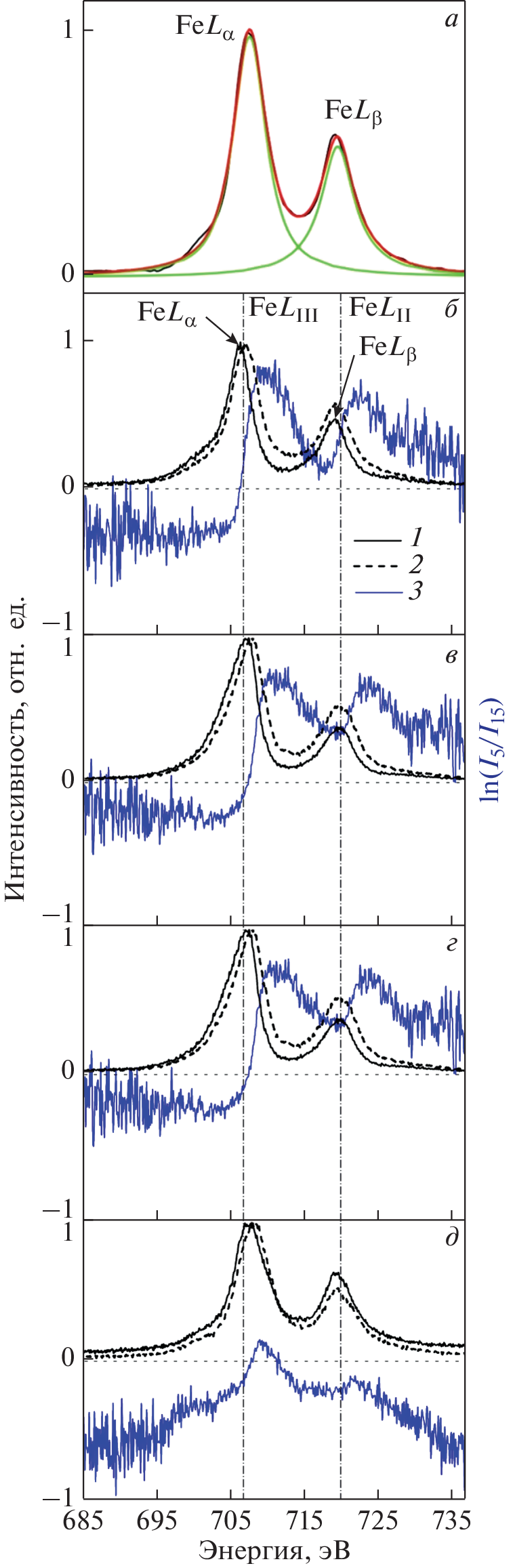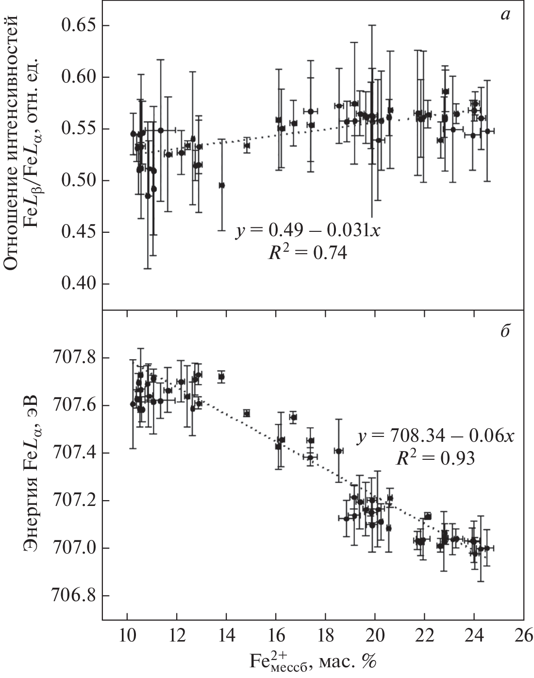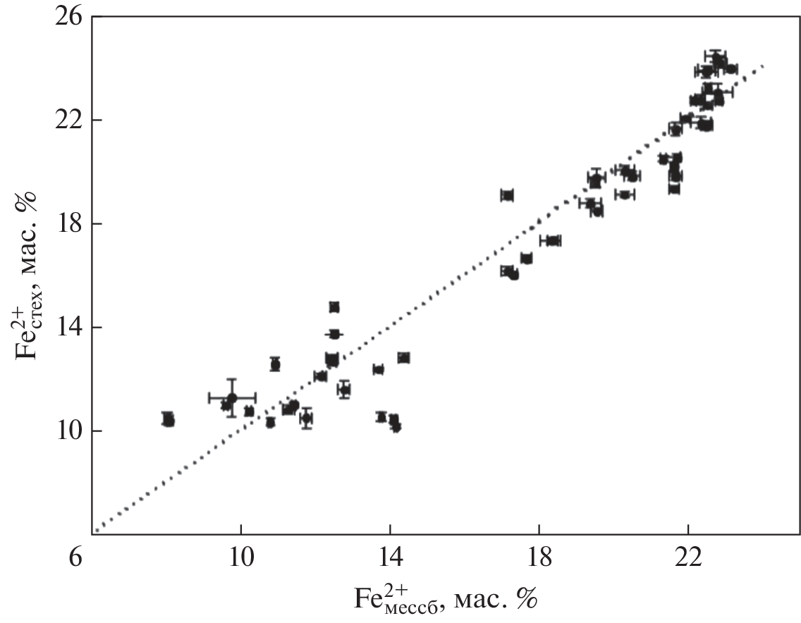 The oxidation state of Fe, Cu, Eu, Ce, etc. in minerals is an important indicator of redox conditions for their formation and evolution. In this work, the features of X-ray emission Fe Lα,β spectra (XES) obtained by Cameca SX100 microprobe, as well as the Mössbauer spectra of Cr-spinels of various compositions from a number of the Urals ultramafic massifs, have been studied. Using microprobe data on the composition and homogeneity of the grains, as well as the Fe3+/\({\text{Fe}}_{{{\text{tot}}}}^{{{\text{M\"o ssb}}}},\) 19 intralaboratory reference samples have been selected from a large number of the Urals Cr-spinels. Based on the analysis of BSE images and maps of the distribution of elements in Cr-spinel grains, the most homogeneous ones were identified. It was shown that, up to the determination error, Fe3+/\({\text{Fe}}_{{{\text{tot}}}}^{{{\text{M\"o ssb}}}}\) coincides with that obtained in the framework for calculation approach based on microprobe data on the composition and assumptions about the mineral stoichiometry. For determination of Fe oxidation state by XES data, it has been proposed to use as a calibration dependence for intralaboratory reference samples the position of the maximum of Fe Lα line on the content of Fe2+; the latter is satisfactorily approximated by a linear function (rxy = 0.96); the relative error of Fe2+ determination is 2%. Approbation of the developed approach was carried out on a series of control samples of Cr-spinels; the obtained values of Fe2+ and Fe3+/Fetot agree satisfactorily with the Mössbauer and calculated data in the stoichiometric approximation.
