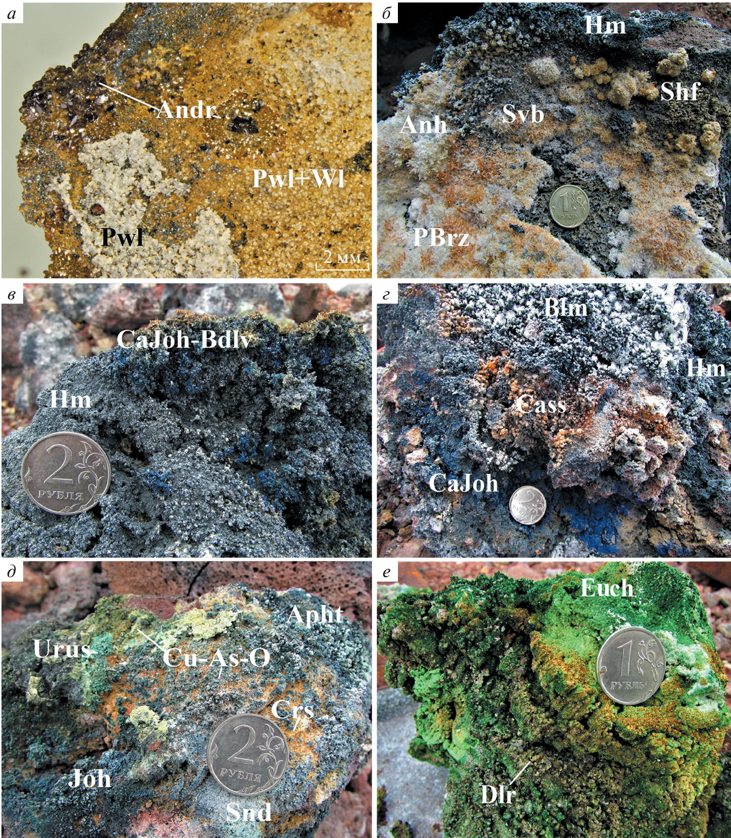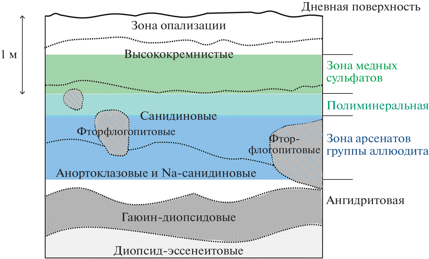 Five specific types of silicate apobasaltic gas metasomatites formed in the temperature range from 850–900 to 450–500 °C have been identified and characterized in oxidizing-type fumaroles at the Tolbachik volcano (Kamchatka, Russia): (1) diopside-esseneite, (2) haüyne-diopside, (3) anorthoclase/Na-sanidine, (4) sanidine, and (5) fluorophlogopite/sanidine-fluorophlogopite metasomatites. Exhalation incrustations of certain mineral and chemical composition are related to each of these types. In the vertical section of the fumarole system from bottom to top, against the background of volcanic gas cooling, a sequential spatial change of the first four types of gas metasomatites occurs. Fluorophlogopite and sanidine-fluorophlogopite gas metasomatites have not a clear position in the vertical section of the fumarole system and presumably are formed under the action of a gas significantly enriched with Cl and F. Highly siliceous metasomatites, consisting mainly of silica phases, form instead of silicate rocks at temperatures below 450–500 °C.