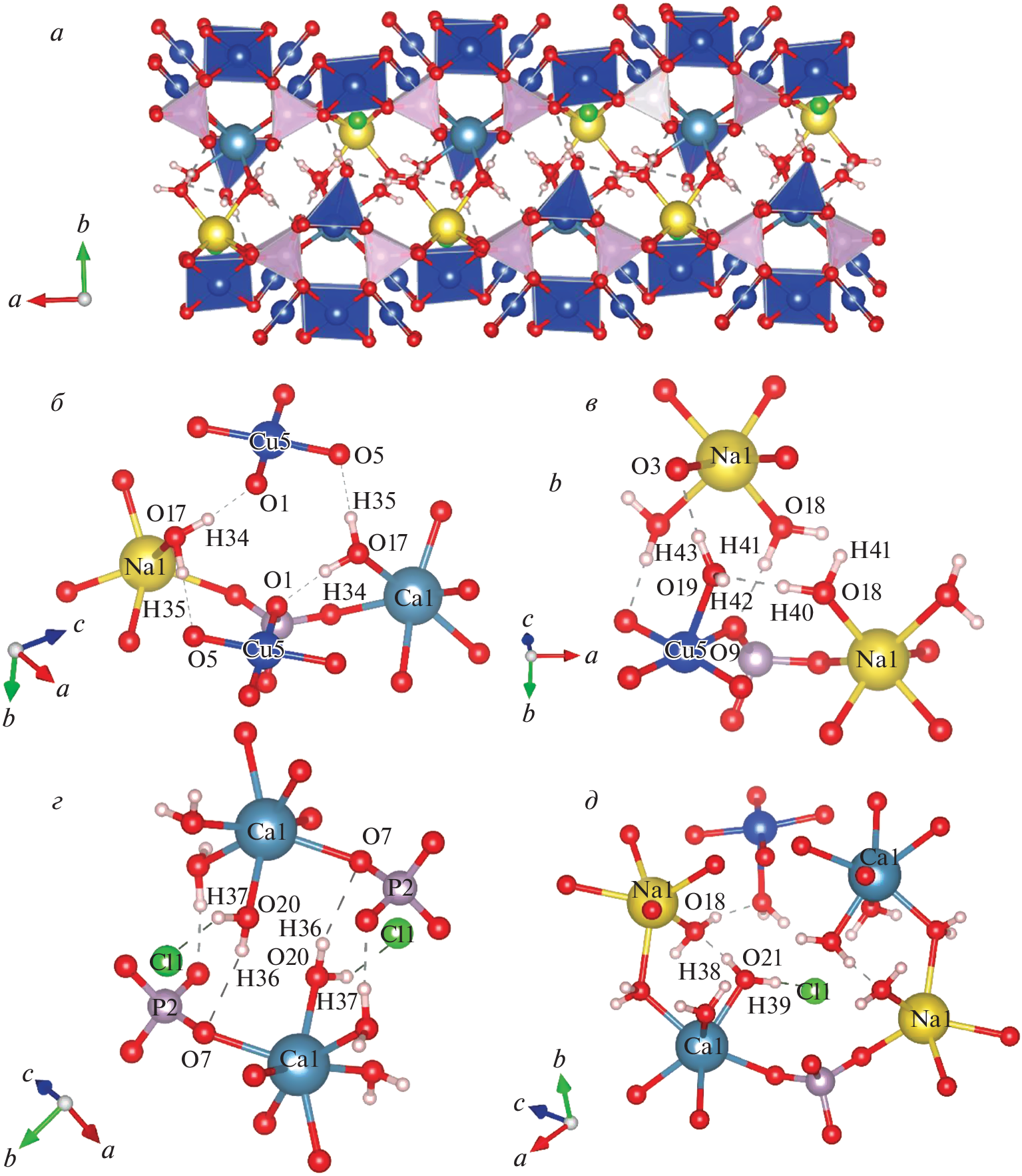 В статье приводится кристаллохимическое описание второй находки P21/n модификации самплеита NaCaCu5(PO4)4Cl·5H2O, сделанной на Кестёрском оловорудном месторождении. Образование минерала генетически связано с низкотемпературными процессами окисления первичных сульфидов меди, цинка и олова, а также с формированием более поздних Cu-, Zn-фосфатов, таких как батагаит, епифановит и сергейсмирновит. С помощью DFT-метода произведeн расчeт положений атомов водорода в структуре самплеита. В качестве оценки достоверности теоретических расчeтов проведено сравнение реального и теоретического ИК-спектров. Самплеит образовался на стадии гидротермального изменения сульфидных минералов Sn, Cu и Zn и сосуществовал с епифановитом NaCaCu5(PO4)4[AsO2(OH)2]·7H2O, который, несомненно, является более поздним, но имеет меньшую сложность (IG,total), 474.24, чем самплеит 933.32 (бит/яч).