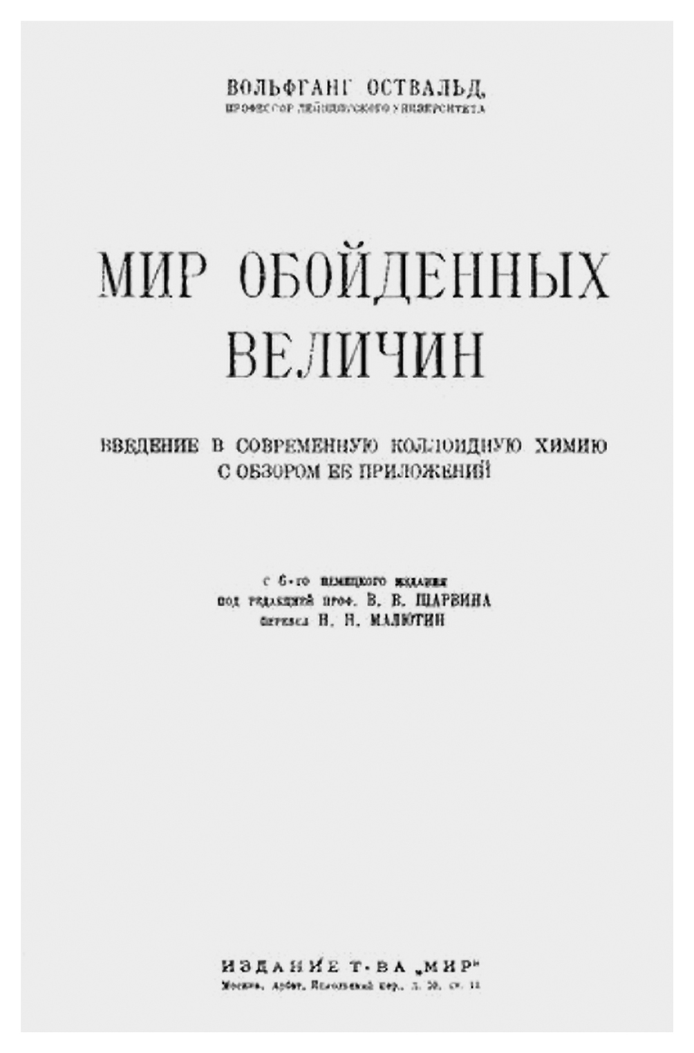 Книга В. Оствальда с названием «Мир обойденных величин» впервые вышла в 1915 году и к 1923 году, когда появилось русское издание, выдержала шесть изданий (Оствальд, 1923) (рис. 1). Она имела подзаголовок «Введение в современную коллоидную химию с обзором ее приложений». Речь в ней шла о свойствах различных коллоидных систем, среди которых золи, коллоидные растворы, мицелы, микроэмульсии и т.д. Это реально огромный круг явлений, идей — «почти необозримая область знания», имеющая весьма важное теоретическое и практическое значение.