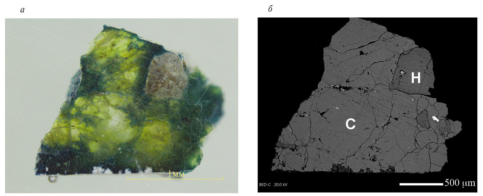 Fig. 1. Aggregate of zonally coloured grains of sodalite-sapozhnikovite series minerals (С) with nepheline (Н): sample ИП Сейд-4925 after heating in bonfire. Polished section: (а) — photograph under conventional light, (б) — SEM image, BSE mode. Sample width: 2 mm.