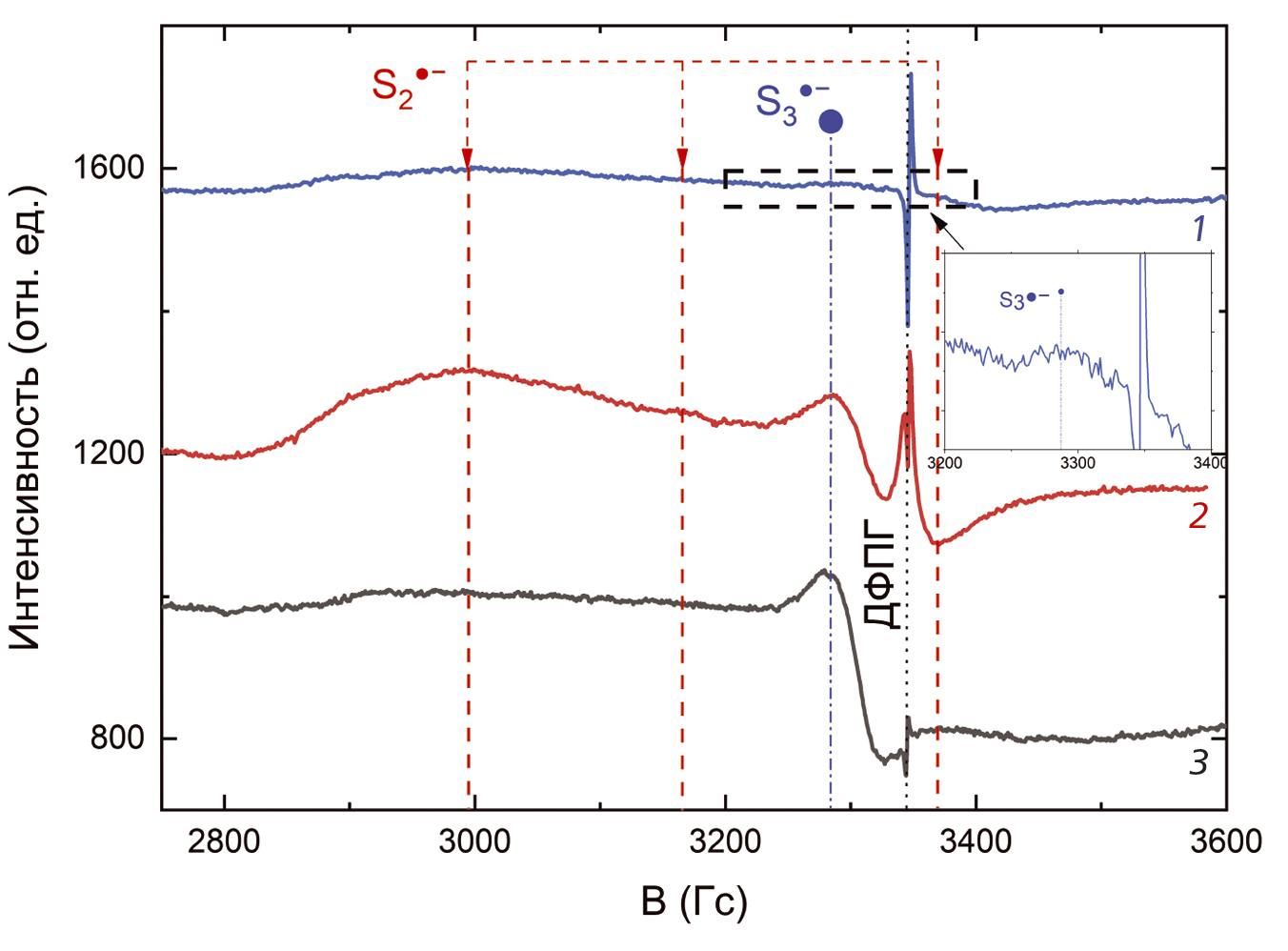 Рис. 12. Спектры ЭПР голотипного сапожниковита, облученного рентгеновской трубкой (кривая 1), голотипного сапожниковита, прогретого до 700 °C в муфельной печи на воздухе (кривая 2), и синего фельдшпатоида из подвергшегося обжигу в костре образца ИП Сейд-4925 (кривая 3). Вертикальными штриховыми линиями показана область, где находится сигнал от анион-радикалов S2●−, штрихпунктирной линией — сигнал от анион-радикалов S3●−, пунктирной линией — сигнал от стандарта дифенилпикрилгидразила (узкая полоса).
