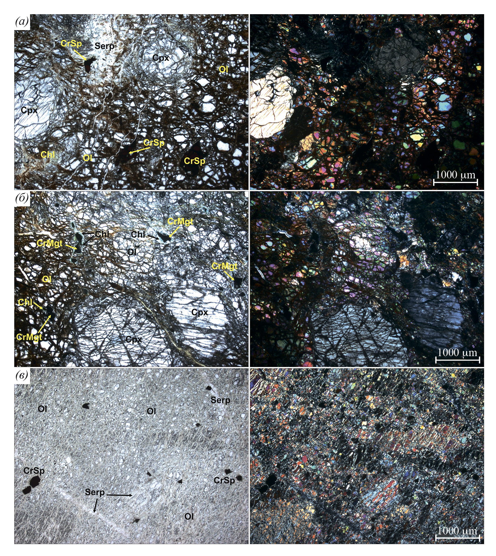 а–б, hypidiomorphic grained harzburgites (samples 14 and 112, respectively), c, porphyroleistic dunite (sample 160). Ol — olivine, Opx — orthopyroxene, Serp — serpentine, Chl — chlorite, CrSp — chrome spinel, CrMgt — chromomagnetite.