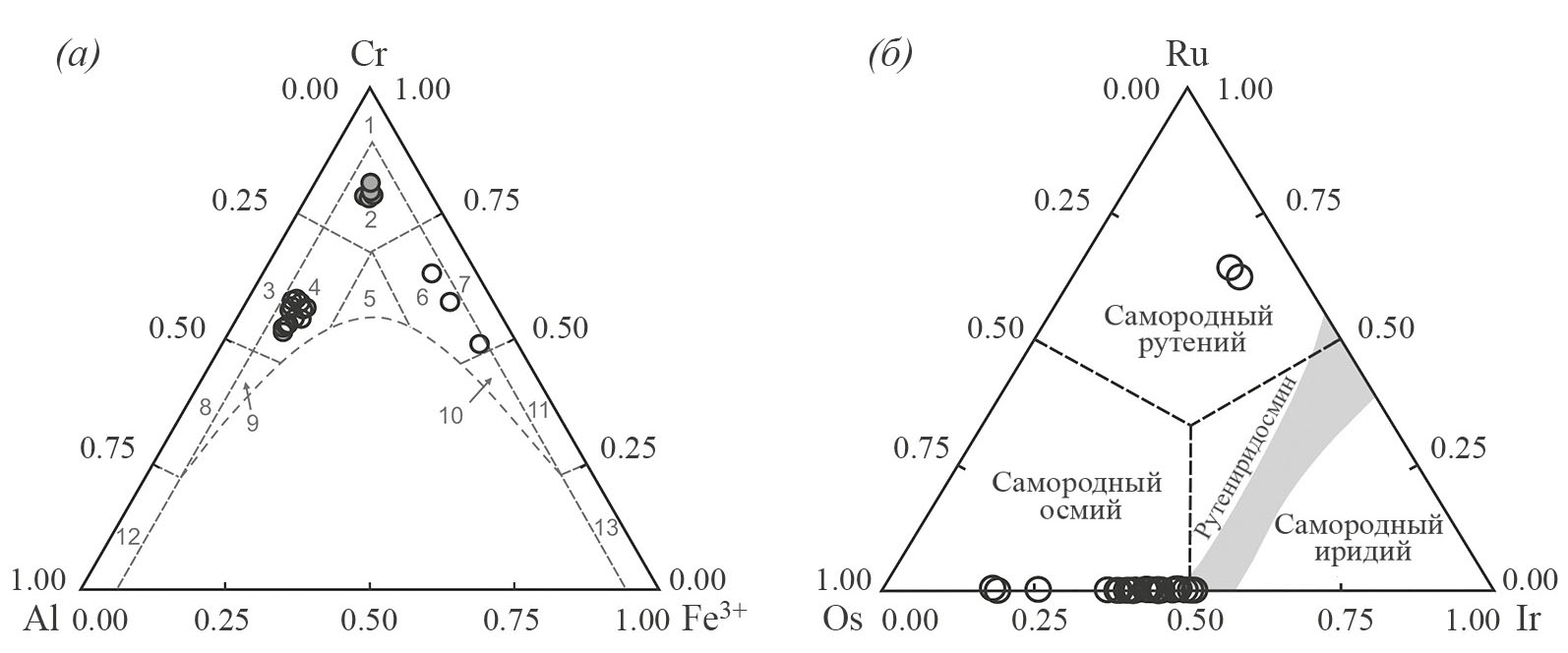 а — состав акцессорных хромшпинелидов из гарцбургитов (белые кружки) и дунитов (серые кружки) на классификационной диаграмме Н.В. Павлова (1949) (1 — хромит, 2 — субферрихромит, 3 — алюмохромит, 4 — субферриалюмохромит, 5 — ферриалюмохромит; 6 — субалюмоферрихромит; 7 — феррихромит; 8 — хромпикотит; 9 — субферрихромпикотит, 10 — субалюмохроммагнетит, 11 — хроммагнетит, 12 — пикотит, 13 — магнетит); б — состав микровключений МПГ Os–Ir–Ru в пентландите и аваруите из гарцбургитов на классификационном треугольнике (Harris, Cabri, 1991).