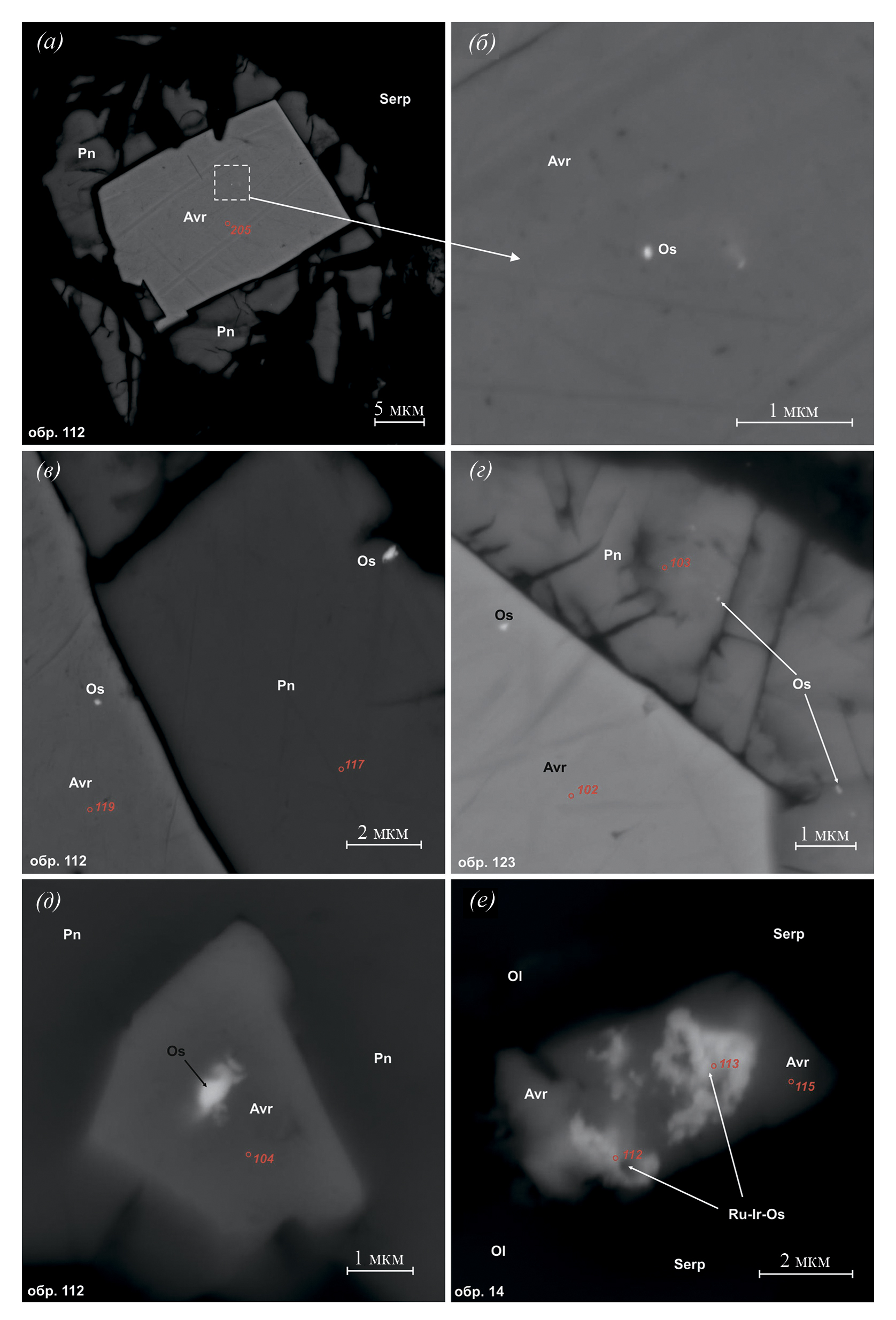 Обособление самородного осмия, Ir-содержащего осмия, тетраферроплатины и неназванной минеральной фазы (Pt,Ir)Fe в виде более крупных дискретных фаз (микровключений) авторы связывают с субсолидусным перераспределением ЭПГ при остывании и серпентинизации. Данный вывод находит подтверждение в более ранних работах (Edwards, 1990; Ohnenstetter, 1992; Prichard et al., 1994; Luguet et al., 2004; Lorand, Luguet, 2016).