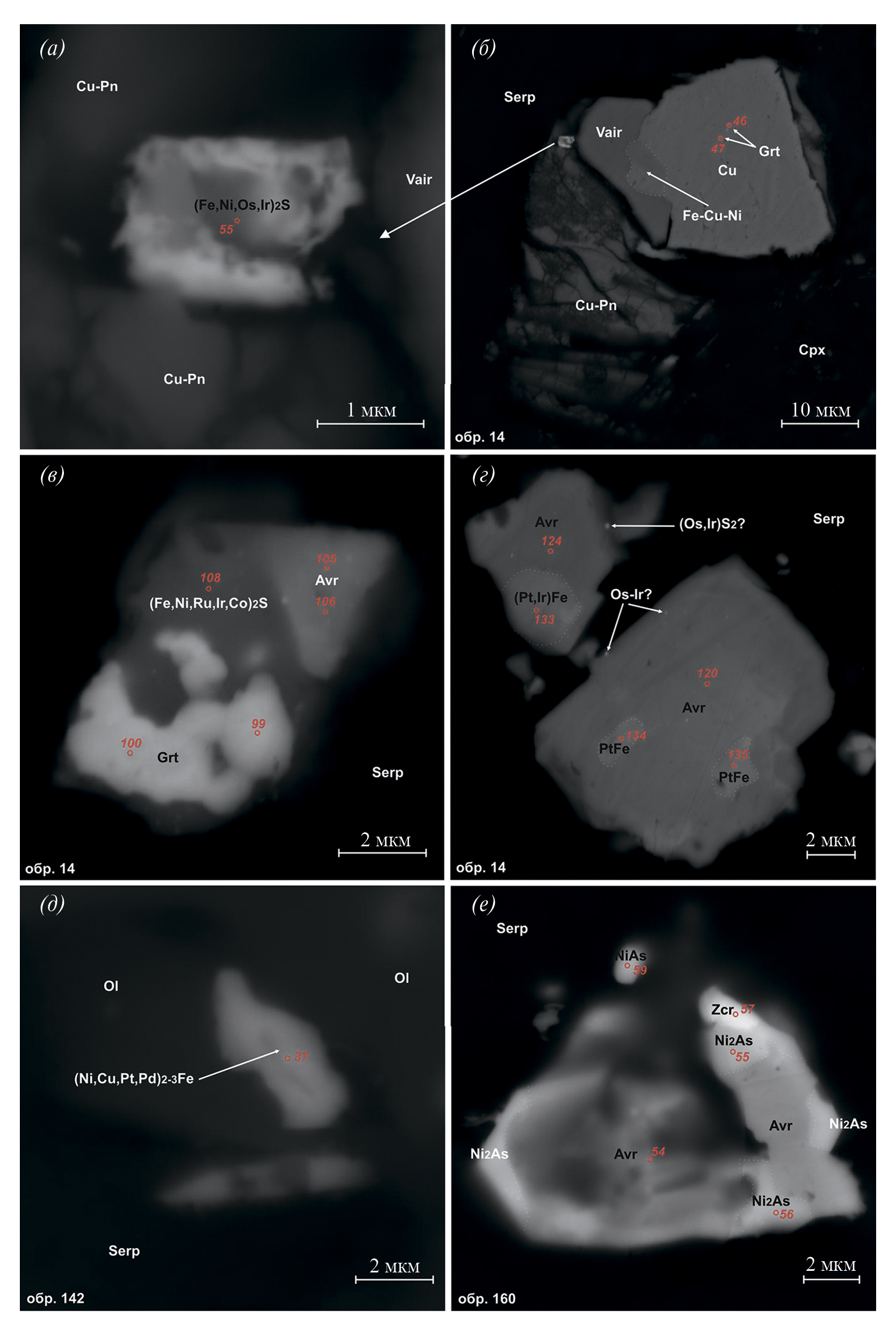 Неназванная фаза (Ni,Cu,Pd,Pt)2-3Fe обнаружена в силикатной матрице вблизи выделения серпентинизированного оливина в виде самостоятельных гипидиоморфных зерен размером до 5 мкм (рис. 6, д). Ее формула близка аваруиту, но отличается наличием в катионной группе, наряду с никелем, меди (до 33.8 мас. %), платины (до 13.6 мас. %) и палладия (до 11.5 мас. %) (табл. 6).