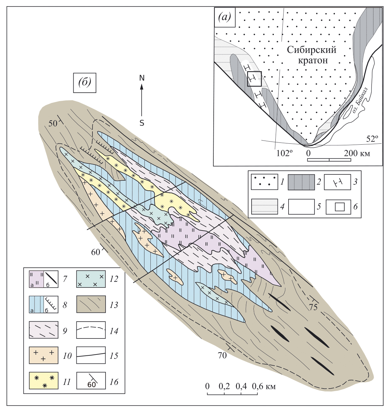 Fig. 1. Location (a) and the geological scheme (б) of the Sredneziminsky massif (after Frolov et al., 2003). In fig. a: 1 — Phanerozoic sedimentary cover of the Siberian craton; 2 — Early Precambrian basement protrusions of the Siberian craton; 3 — Paleoproterozoic Urik-Iya graben; (4) deposits of the Neoproterozoic margin of the craton; 5 ‒ Central Asian folded belt; 6 — region of location of the Sredneziminskii massif; in fig. б: 7 — ankerite and dolomitic carbonatites (a — zones, б — veins); 8 — aegirine-biotite-calcite carbonatites (a — zones, б — veins); 9 — biotite-calcite carbonatites; 10 — subalkaline syenites; 11 — nepheline syenites; 12 — melteigites and ijolites; 13 — quartz-micaceous shales; 14 — zone of fenitization of shales; 15 — discontinuous violations; 16 — elements of occurrence of schistosity–layering.