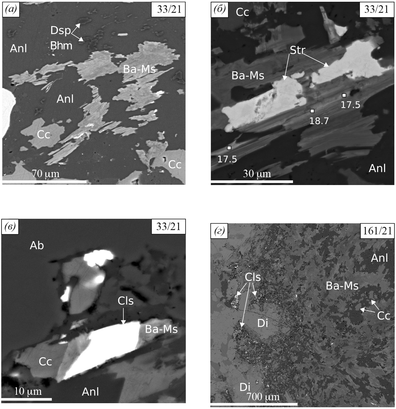 Барийсодержащий мусковит представлен зернами величиной от менее 0.01 до 0.3 мм в образцах ийолита 33/21 и сиенита 173/21 и величиной до 1 мм в образце ийолита 161/21. В образце ийолита 33/21 зерна Ва-содержащего мусковита ассоциируют с анальцимом, реже натролитом (табл. 1), диаспором/бёмитом, альбитом, кальцитом, стронцианитом (рис. 2, а‒в). Содержание Ва возрастает в краевых зонах зерен слюды, что на BSE-изображениях проявляется в виде светлых участков или каемок (рис. 2, а); наблюдается также послойное обогащение зерен мусковита барием (рис. 2, б). Изредка в породе отмечается цельзиан как вторичный минерал по канкриниту в ассоциации с Ва-содержащим мусковитом (рис. 2, в).